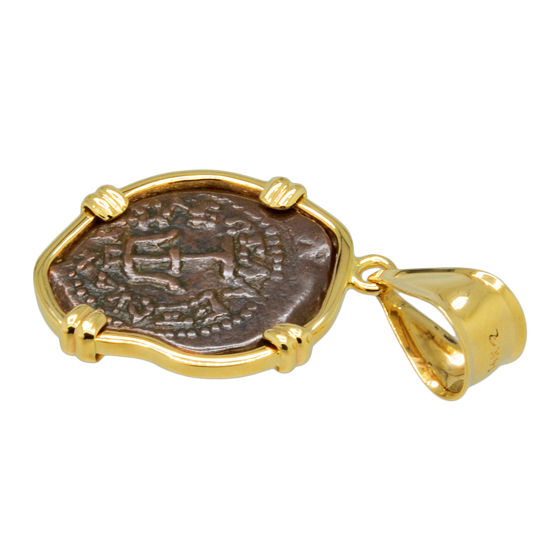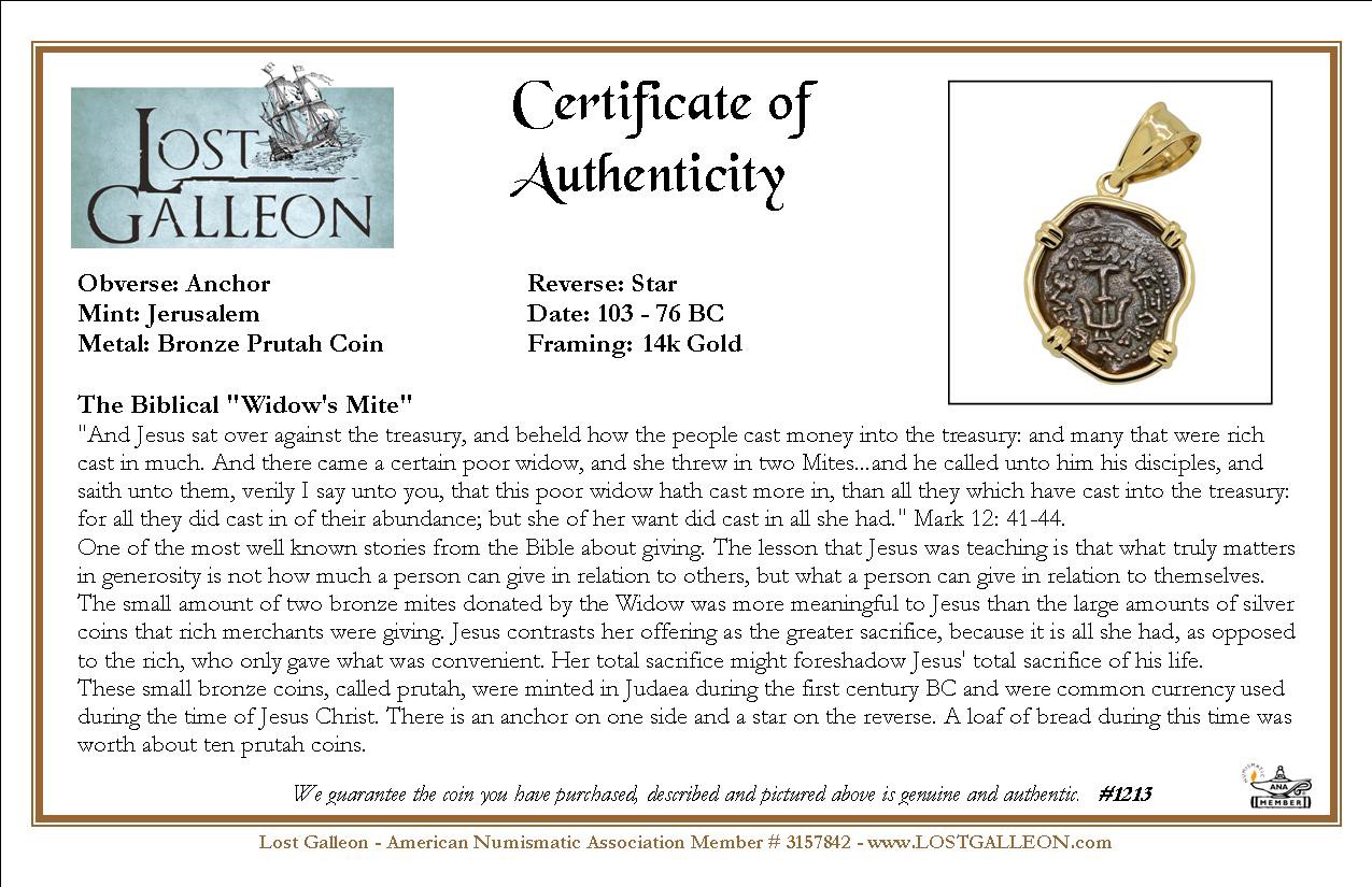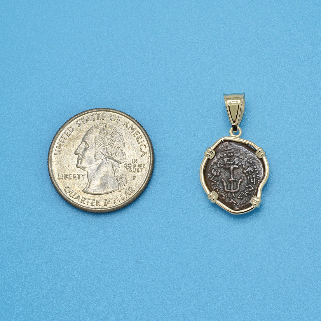 These small bronze coins, called prutah, were minted in Judaea during the first century BC and were common currency used during the time of Christ. There is an anchor on one side and a star on the reverse. A loaf of bread during this time was worth about ten prutah coins.
