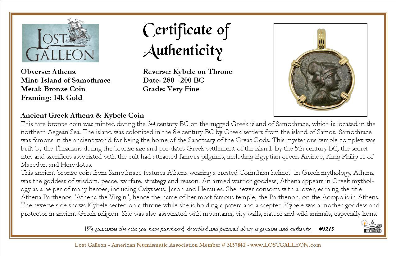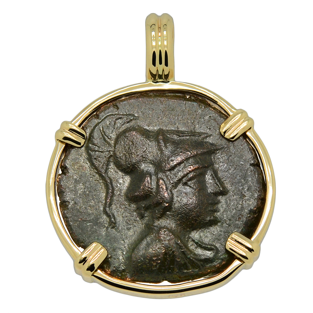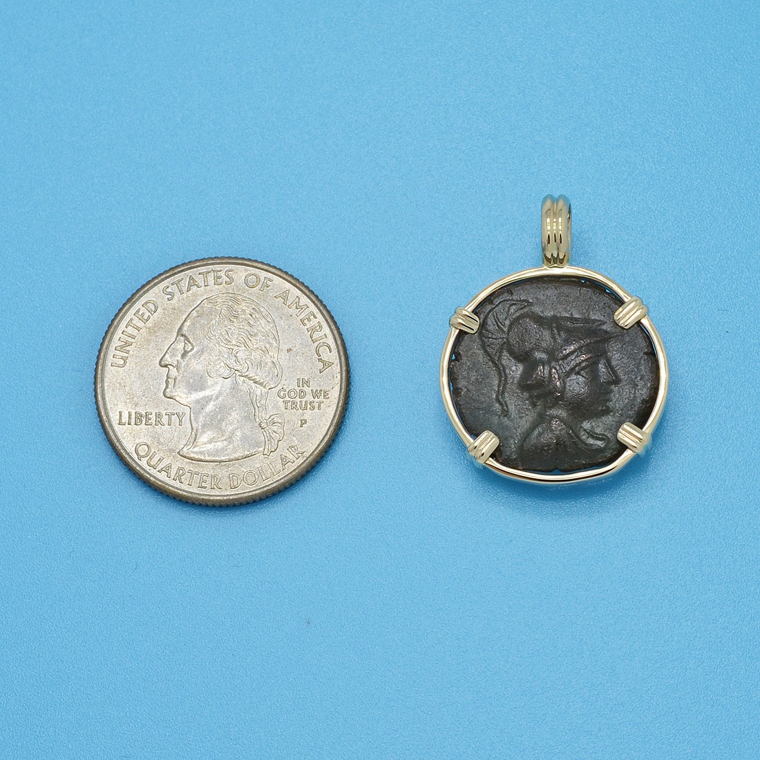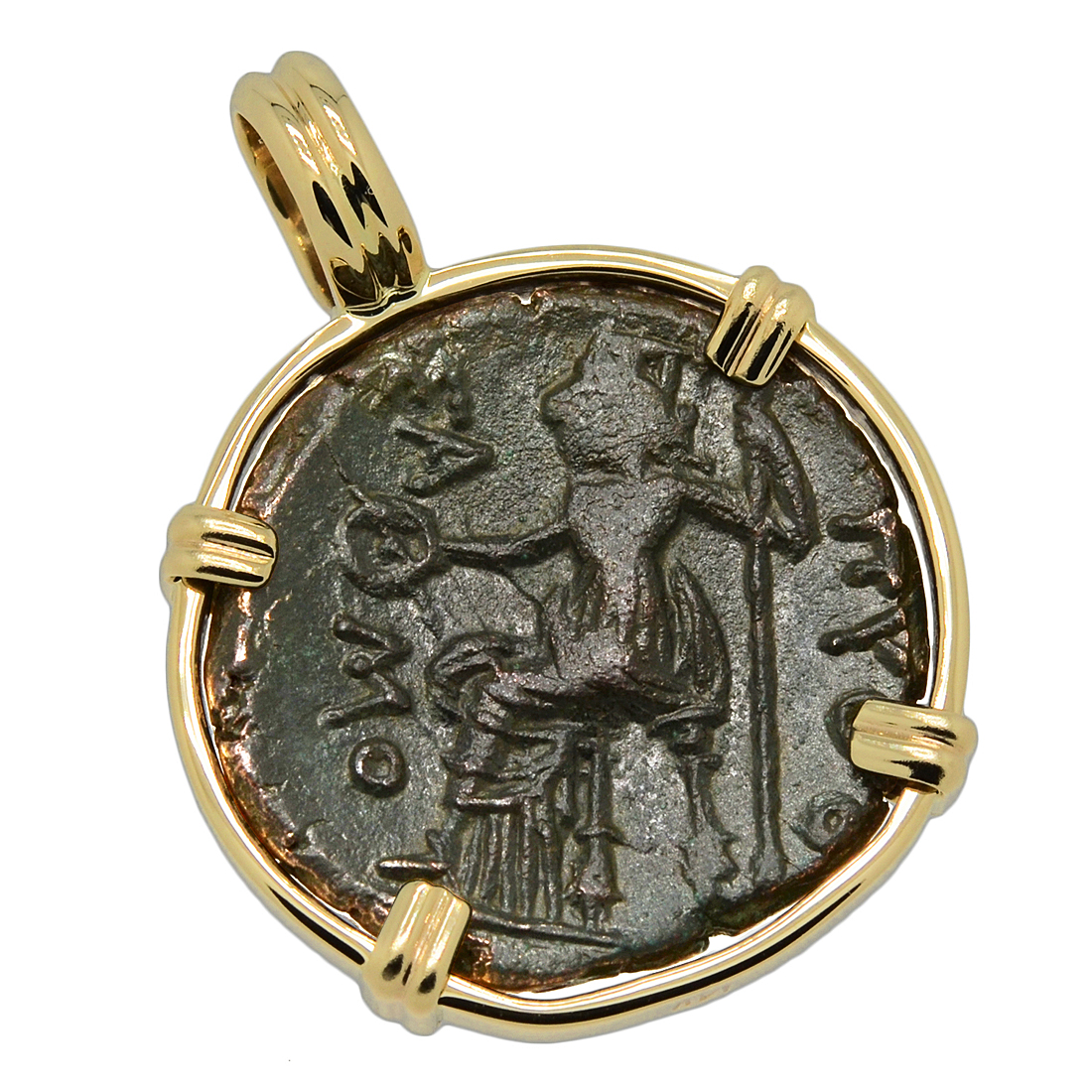 This ancient bronze coin from Samothrace features Athena wearing a crested Corinthian helmet. In Greek mythology, Athena was the goddess of wisdom, peace, warfare, strategy and reason. An armed warrior goddess, Athena appears in Greek mythology as a helper of many heroes, including Odysseus, Jason and Hercules. She never consorts with a lover, earning the title Athena Parthenos "Athena the Virgin", hence the name of her most famous temple, the Parthenon, on the Acropolis in Athens.