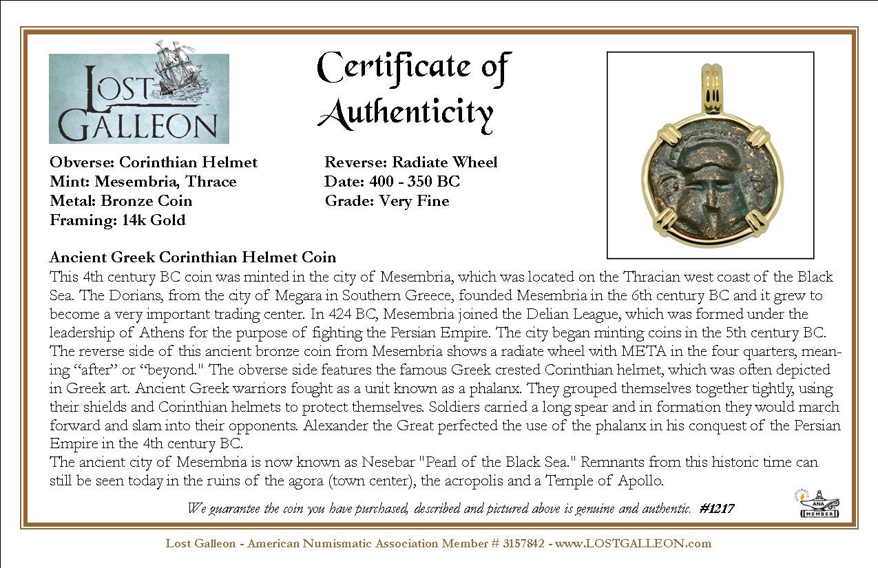 The reverse side of this ancient bronze coin from Mesembria shows a radiate wheel with META in the four quarters, meaning “after” or “beyond." The obverse side features the famous Greek crested Corinthian helmet, which was often depicted in Greek art. Ancient Greek warriors fought as a unit known as a phalanx. They grouped themselves together tightly, using their shields and Corinthian helmets to protect themselves. Soldiers carried a long spear and in formation they would march forward and slam into their opponents. Alexander the Great perfected the use of the phalanx in his conquest of the Persian Empire in the 4th century BC.