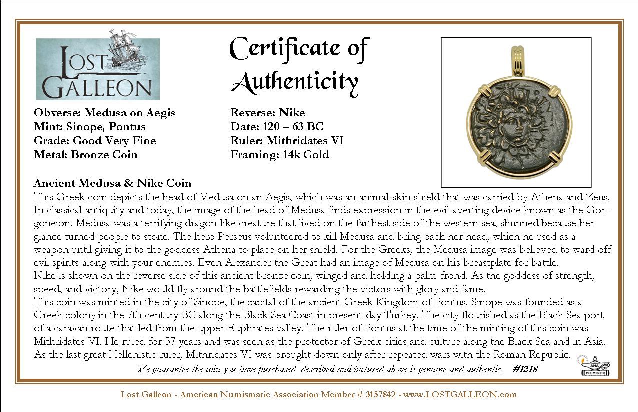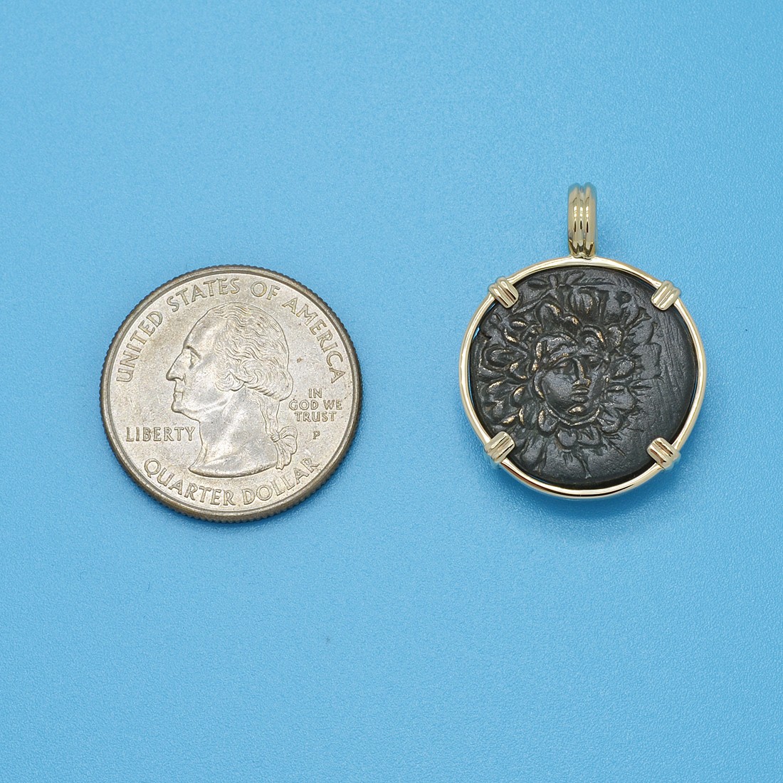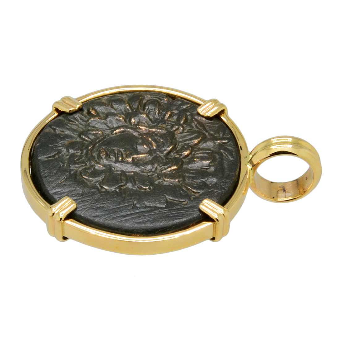 This Greek coin depicts the head of Medusa on an Aegis, which was an animal-skin shield that was carried by Athena and Zeus. In classical antiquity and today, the image of the head of Medusa finds expression in the evil-averting device known as the Gorgoneion. Medusa was a terrifying dragon-like creature that lived on the farthest side of the western sea, shunned because her glance turned people to stone. The hero Perseus volunteered to kill Medusa and bring back her head, which he used as a weapon until giving it to the goddess Athena to place on her shield. For the Greeks, the Medusa image was believed to ward off evil spirits along with your enemies. Even Alexander the Great had an image of Medusa on his breastplate for battle.