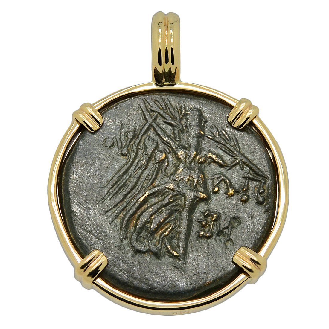 Nike is shown on the reverse side of this ancient bronze coin, winged and holding a palm frond. As the goddess of strength, speed, and victory, Nike would fly around the battlefields rewarding the victors with glory and fame.