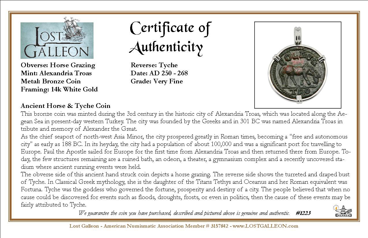 The obverse side of this ancient hand struck coin depicts a horse grazing. The reverse side shows the turreted and draped bust of Tyche. In Classical Greek mythology, she is the daughter of the Titans Tethys and Oceanus and her Roman equivalent was Fortuna. Tyche was the goddess who governed the fortune, prosperity and destiny of a city. The people believed that when no cause could be discovered for events such as floods, droughts, frosts, or even in politics, then the cause of these events may be fairly attributed to Tyche.