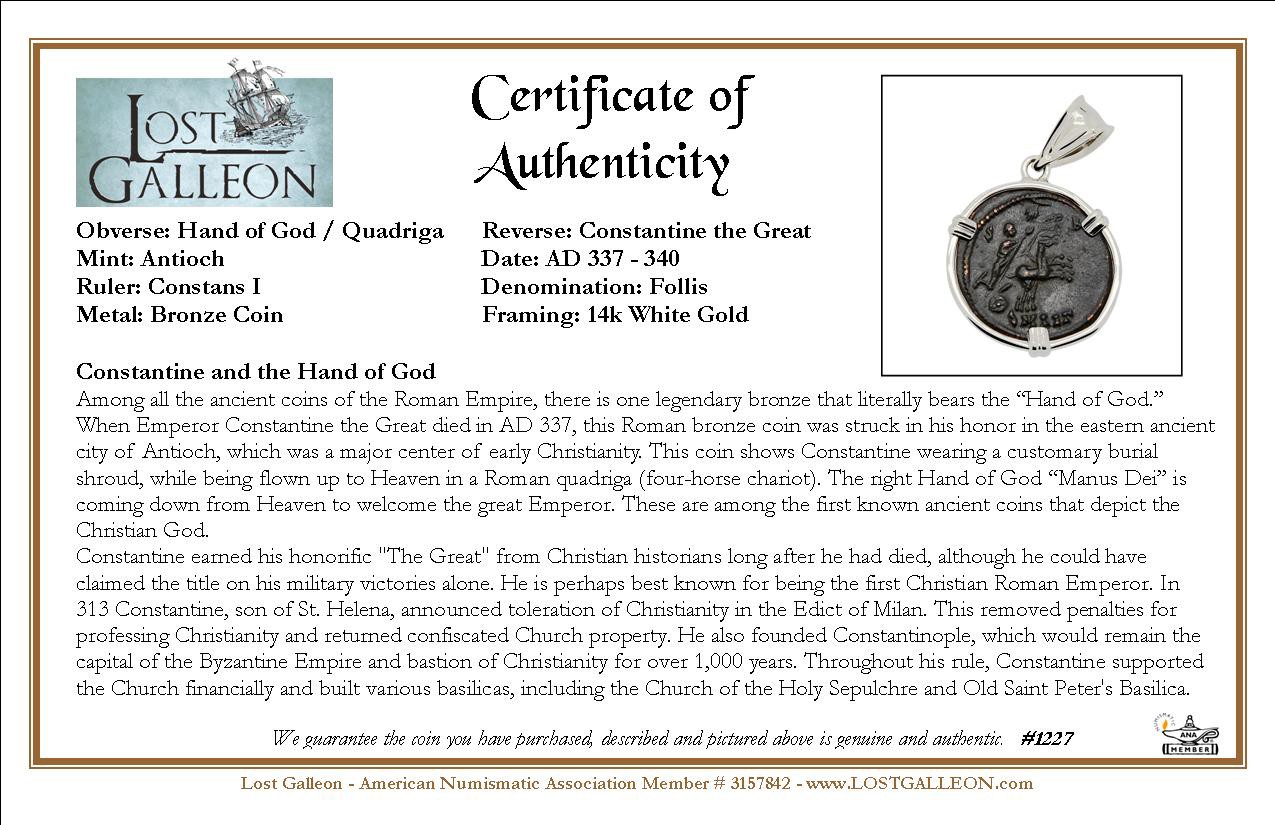 Among all the ancient coins of the Roman Empire, there is one legendary bronze that literally bears the “Hand of God.” When Emperor Constantine the Great died in AD 337, this Roman bronze coin was struck in his honor in the eastern ancient city of Antioch, which was a major center of early Christianity. This coin shows Constantine wearing a customary burial shroud, while being flown up to Heaven in a Roman quadriga (four-horse chariot). The right Hand of God “Manus Dei” is coming down from Heaven to welcome the great Emperor. These are among the first known ancient coins that depict the Christian God.