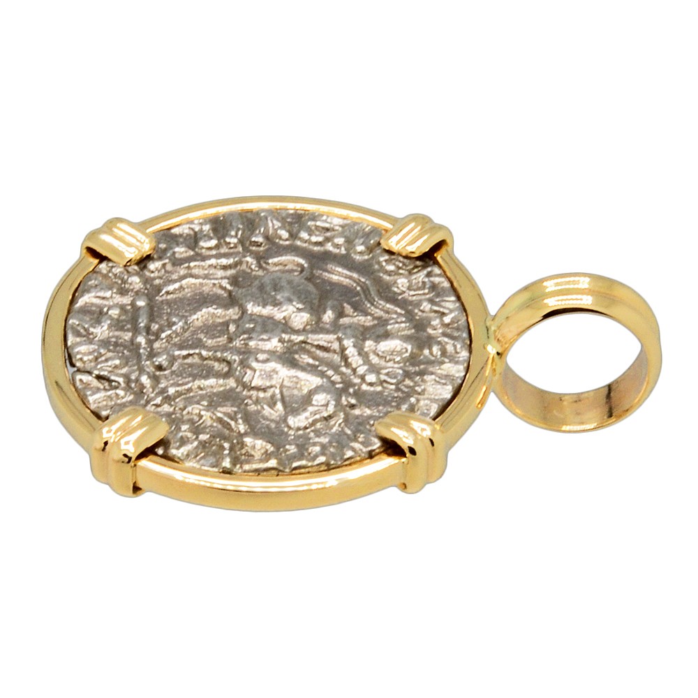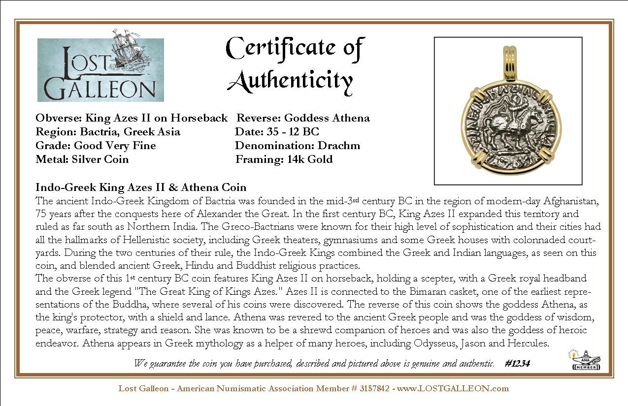 The obverse of this 1st century BC coin features King Azes II on horseback, holding a scepter, with a Greek royal headband and the Greek legend "The Great King of Kings Azes." Azes II is connected to the Bimaran casket, one of the earliest representations of the Buddha, where several of his coins were discovered. The reverse of this coin shows the goddess Athena, as the king's protector, with a shield and lance. Athena was revered to the ancient Greek people and was the goddess of wisdom, peace, warfare, strategy and reason. She was known to be a shrewd companion of heroes and was also the goddess of heroic endeavor. Athena appears in Greek mythology as a helper of many heroes, including Odysseus, Jason and Hercules.