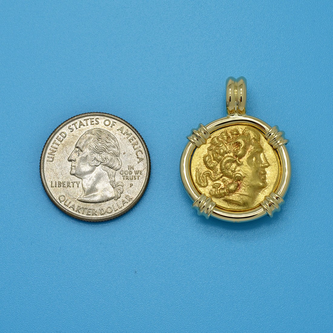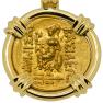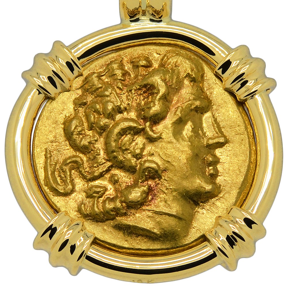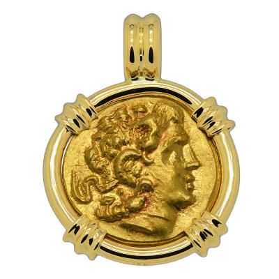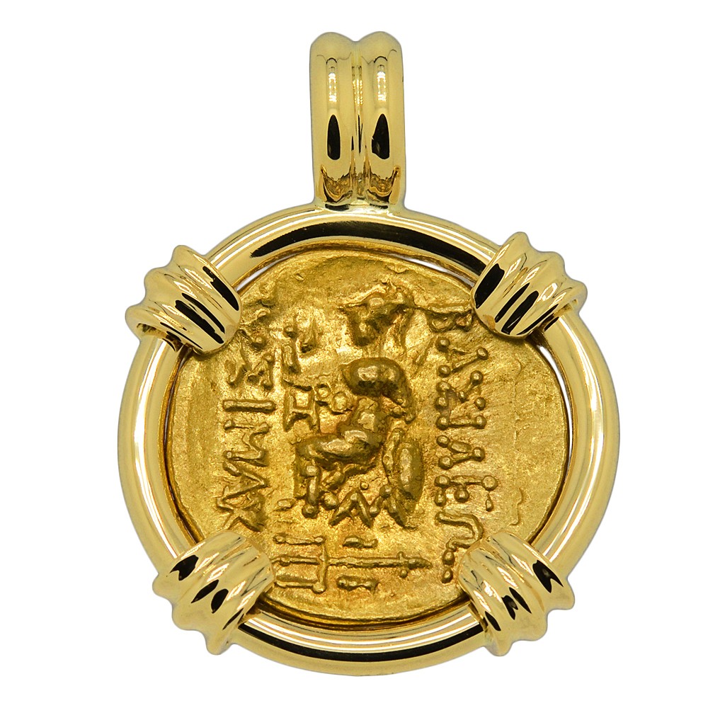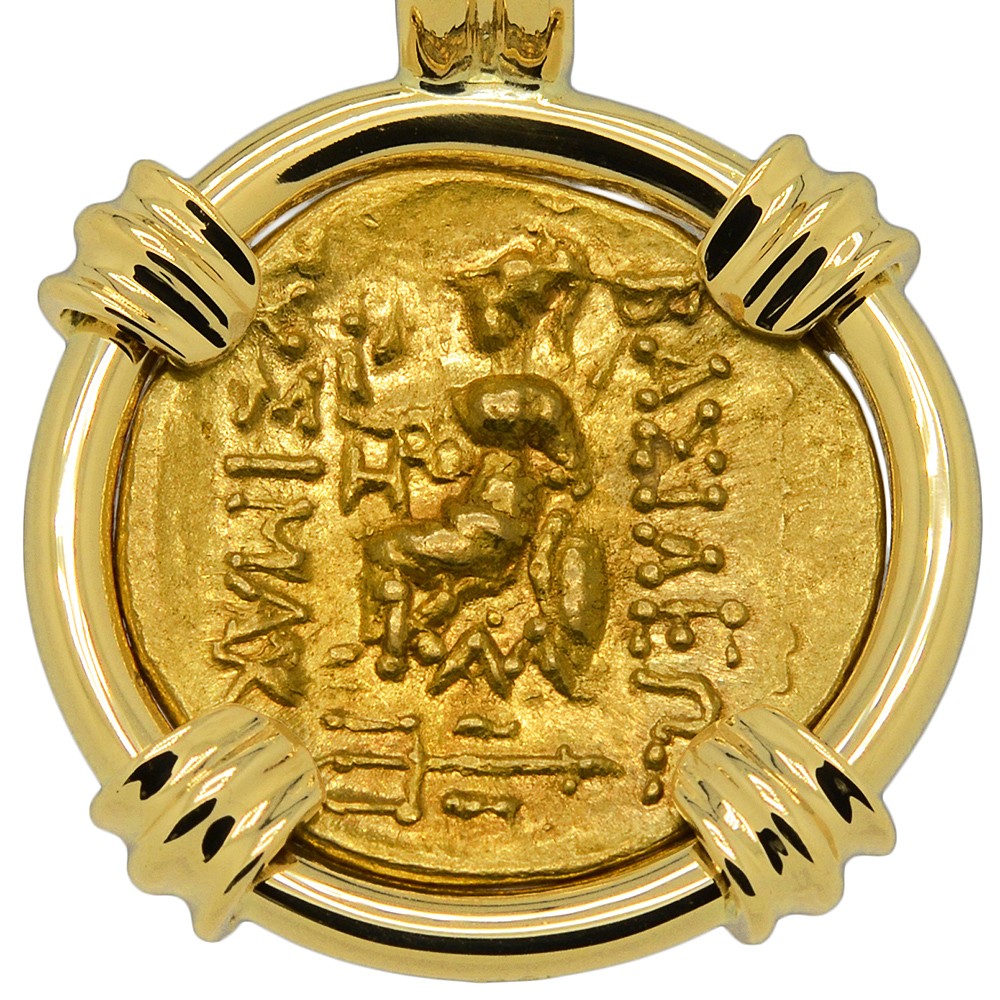 This gold coin was minted in the Thracian coastal Black Sea city of Kallatis during the rule of the Greek King Mithridates VI to pay his army during the 1st Mithradatic War against Rome. The obverse side features Alexander the Great, the most successful military commander of all time. In the 4th century BC, Alexander had overthrown the Persian King Darius III and conquered the entirety of his Empire. Alexander's own Empire in 323 BC stretched from the Adriatic Sea to Egypt and as far east as the Indus River in India. His legacy lived on long after him, ushering in centuries of Greek settlement and Hellenistic culture over distant areas.