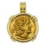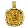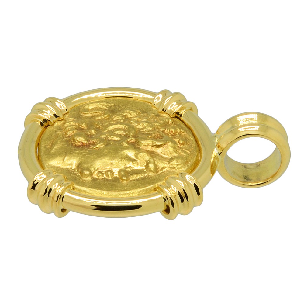 The reverse of this coin shows the armed warrior goddess Athena, seated with a shield, spear and ornamented trident, while she is holding Nike the goddess of victory. Athena was the goddess of wisdom, peace, warfare, strategy and reason. She was known to be a shrewd companion of heroes and was also the goddess of heroic endeavor.