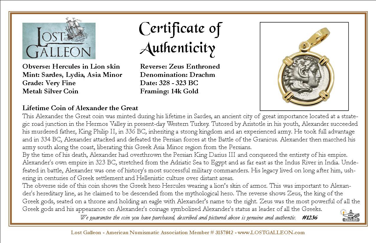 This Alexander the Great coin was minted during his lifetime in Sardes, an ancient city of great importance located at a strategic road junction in the Hermos Valley in present-day Western Turkey. Tutored by Aristotle in his youth, Alexander succeeded his murdered father, King Philip II, in 336 BC, inheriting a strong kingdom and an experienced army. He took full advantage and in 334 BC, Alexander attacked and defeated the Persian forces at the Battle of the Granicus. Alexander then marched his army south along the coast, liberating this Greek Asia Minor region from the Persians.