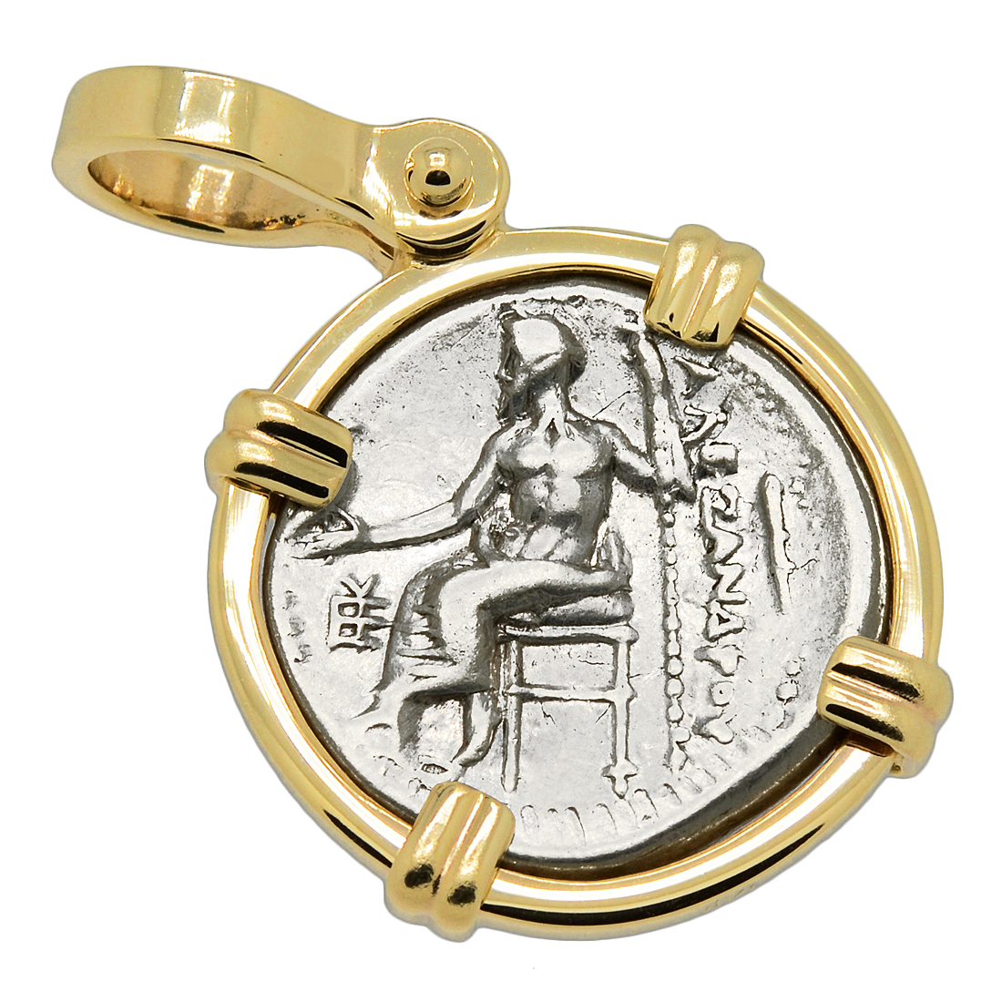 The obverse side of this coin shows the Greek hero Hercules wearing a lion’s skin of armor. This was important to Alexander's hereditary line, as he claimed to be descended from the mythological hero. The reverse shows Zeus, the king of the Greek gods, seated on a throne and holding an eagle with Alexander’s name to the right. Zeus was the most powerful of all the Greek gods and his appearance on Alexander's coinage symbolized Alexander's status as leader of all the Greeks.