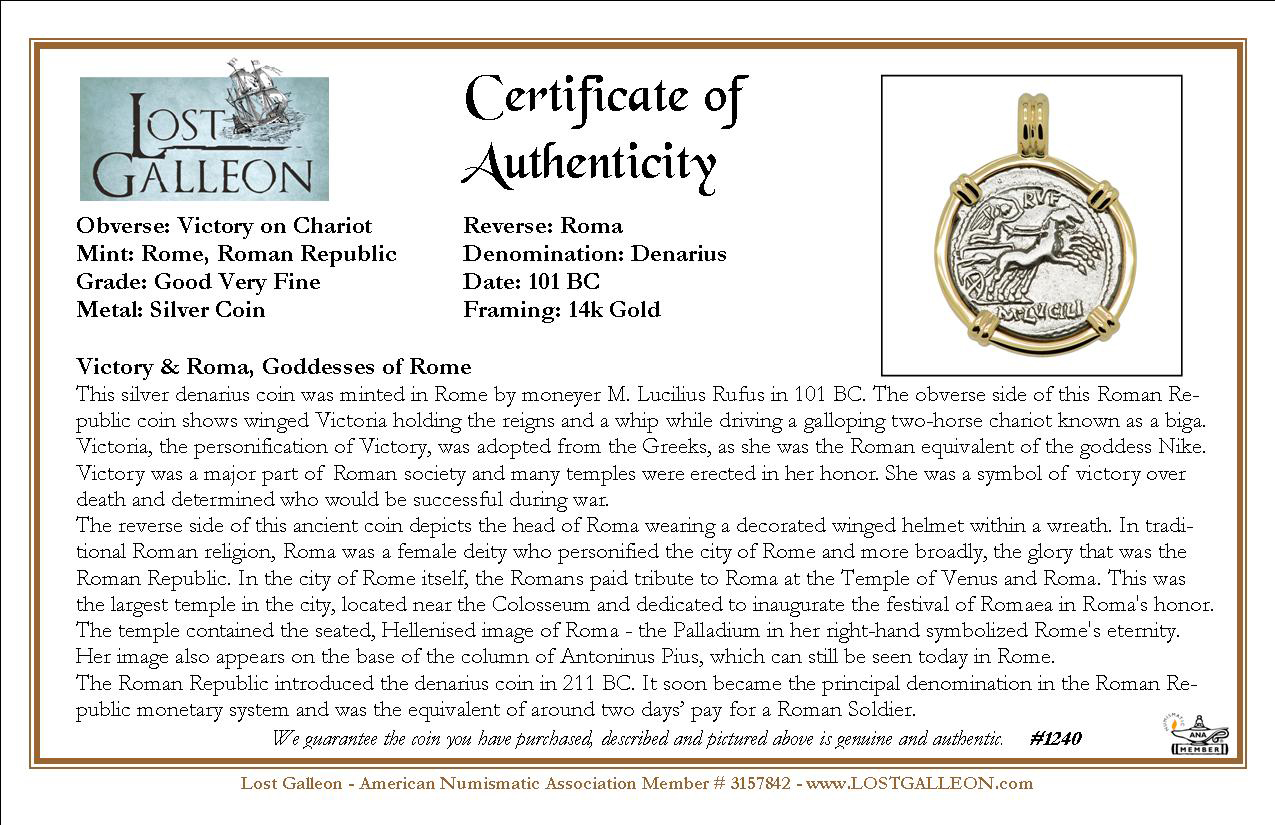 This silver denarius coin was minted in Rome by moneyer M. Lucilius Rufus in 101 BC. The obverse side of this Roman Republic coin shows winged Victoria holding the reigns and a whip while driving a galloping two-horse chariot known as a biga. Victoria, the personification of Victory, was adopted from the Greeks, as she was the Roman equivalent of the goddess Nike. Victory was a major part of Roman society and many temples were erected in her honor. She was a symbol of victory over death and determined who would be successful during war.