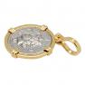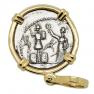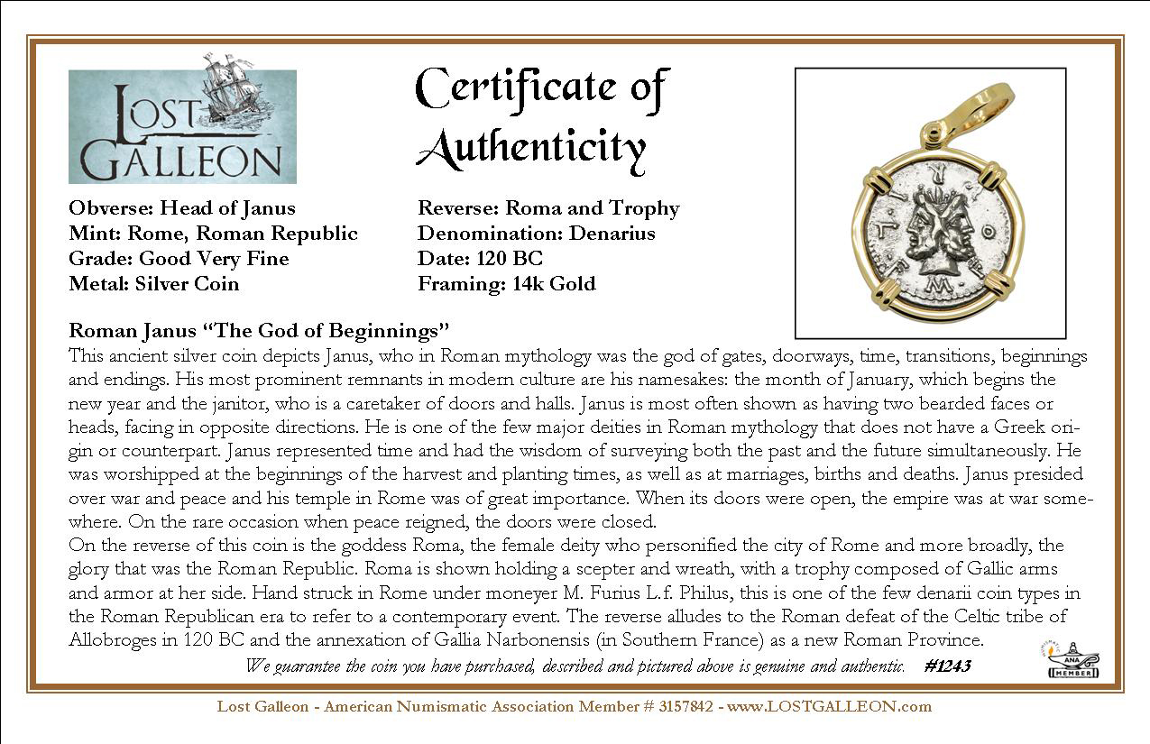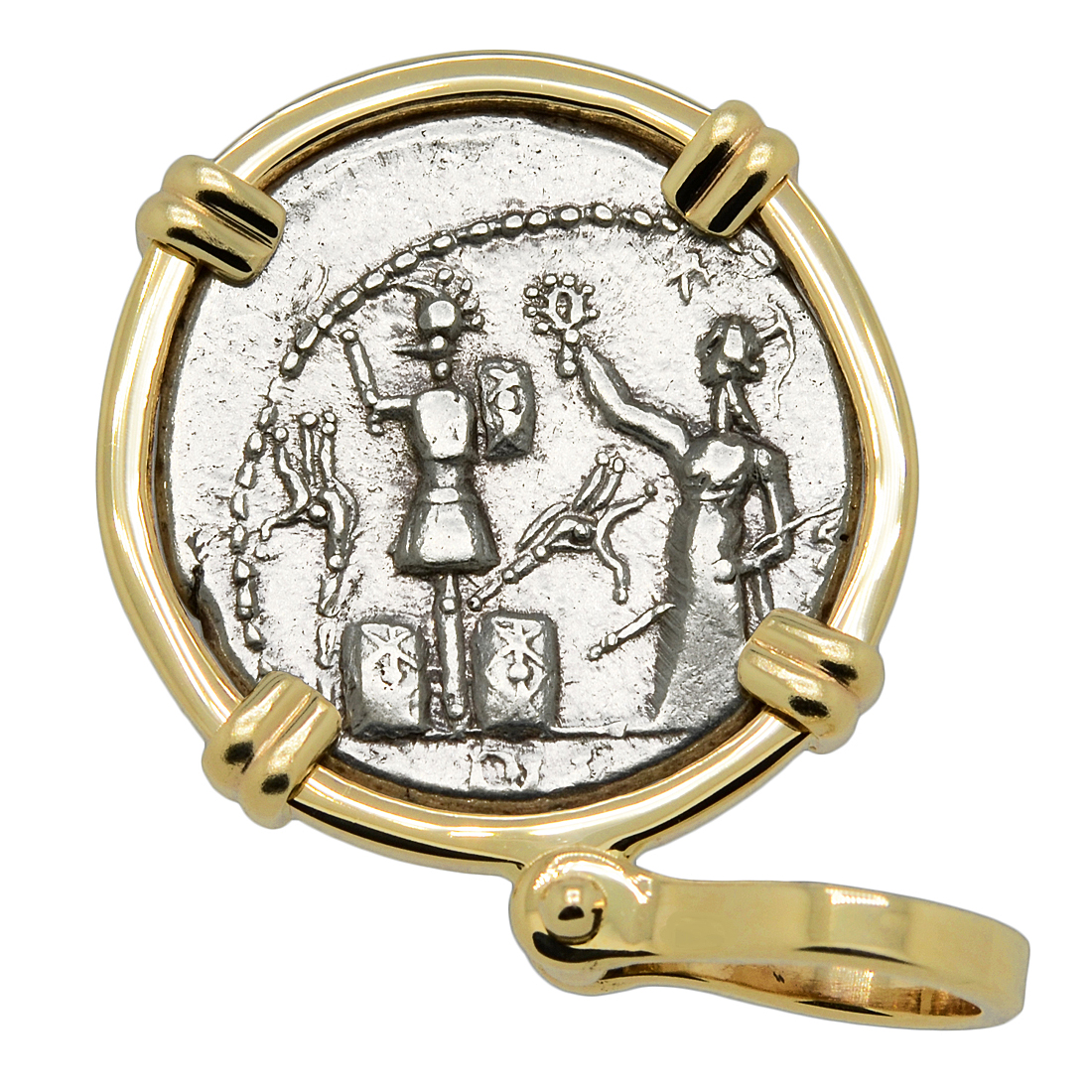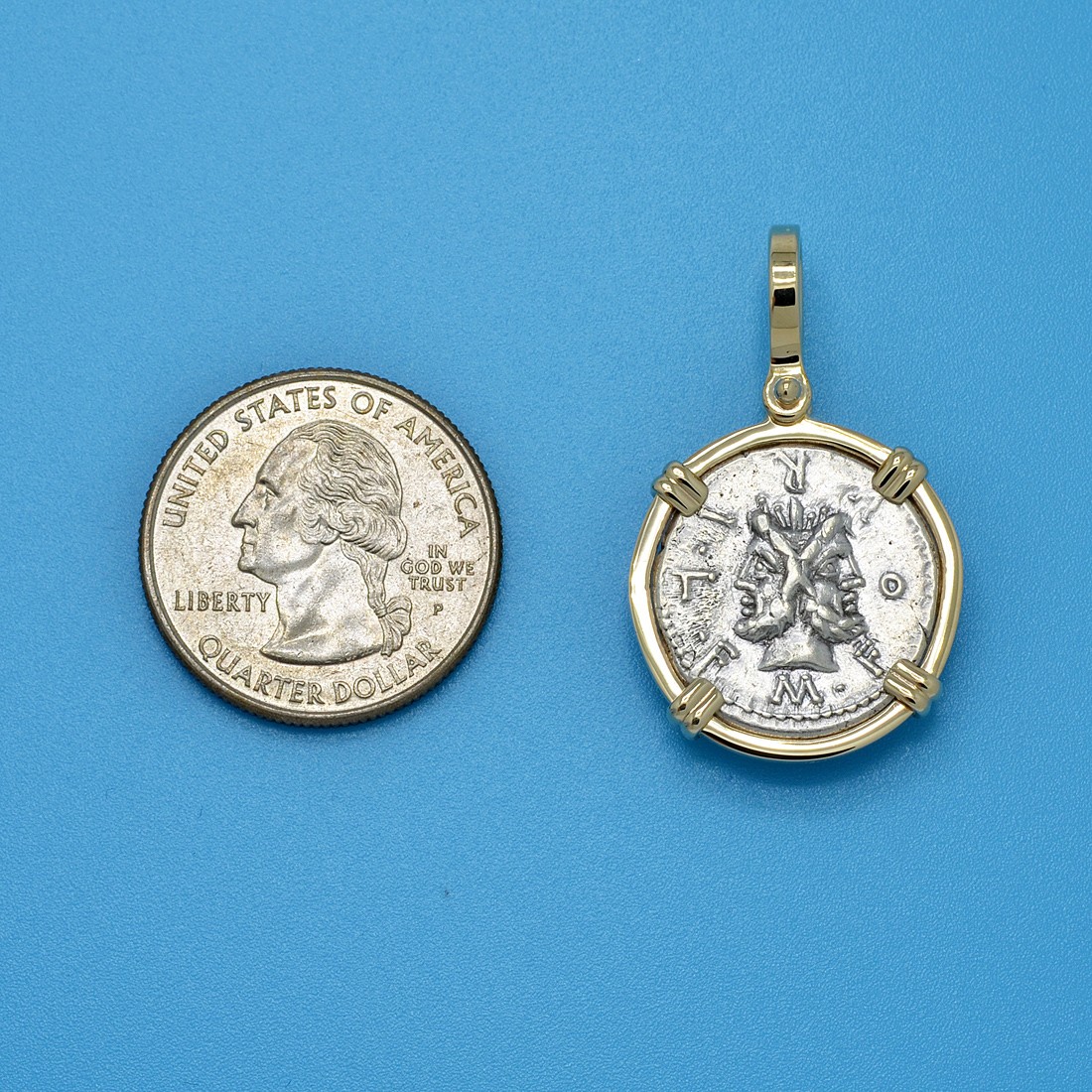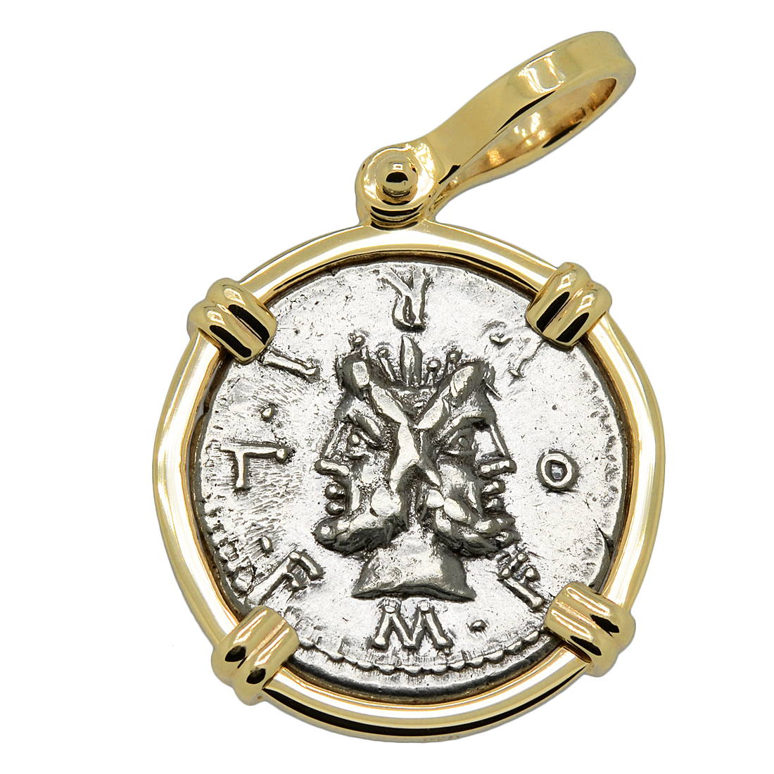 This ancient silver coin depicts Janus, who in Roman mythology was the god of gates, doorways, time, transitions, beginnings and endings. His most prominent remnants in modern culture are his namesakes: the month of January, which begins the new year and the janitor, who is a caretaker of doors and halls. Janus is most often shown as having two bearded faces or heads, facing in opposite directions. He is one of the few major deities in Roman mythology that does not have a Greek origin or counterpart. Janus represented time and had the wisdom of surveying both the past and the future simultaneously. He was worshipped at the beginnings of the harvest and planting times, as well as at marriages, births and deaths. Janus presided over war and peace and his temple in Rome was of great importance. When its doors were open, the empire was at war somewhere. On the rare occasion when peace reigned, the doors were closed.