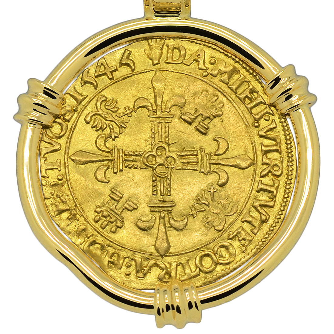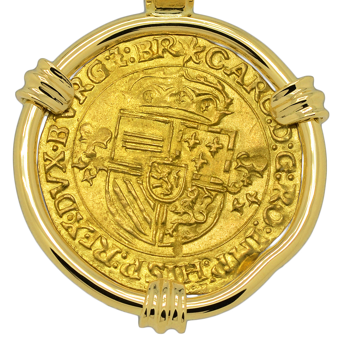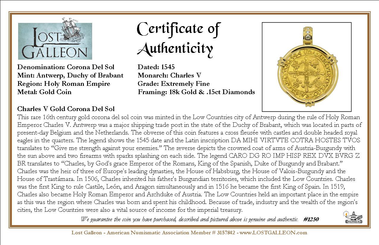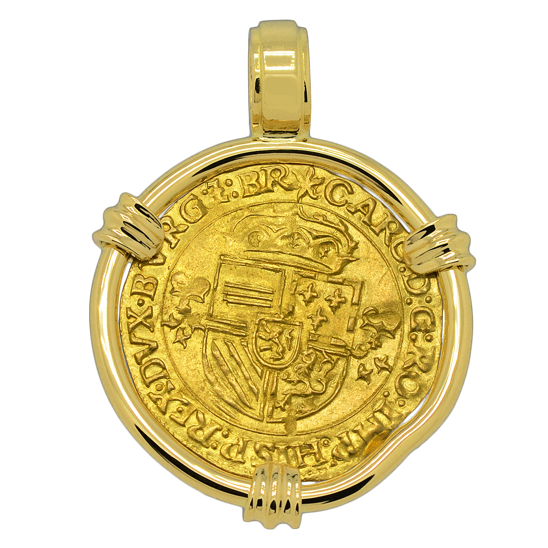 This rare 16th century gold corona del sol coin was minted in the Low Countries city of Antwerp during the rule of Holy Roman Emperor Charles V. Antwerp was a major shipping trade port in the state of the Duchy of Brabant, which was located in parts of present-day Belgium and the Netherlands.