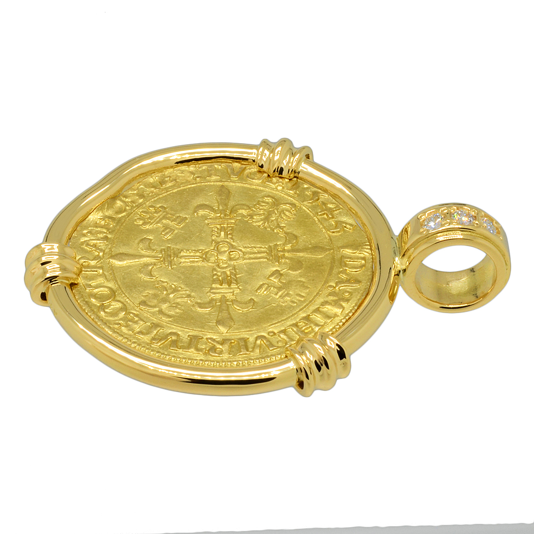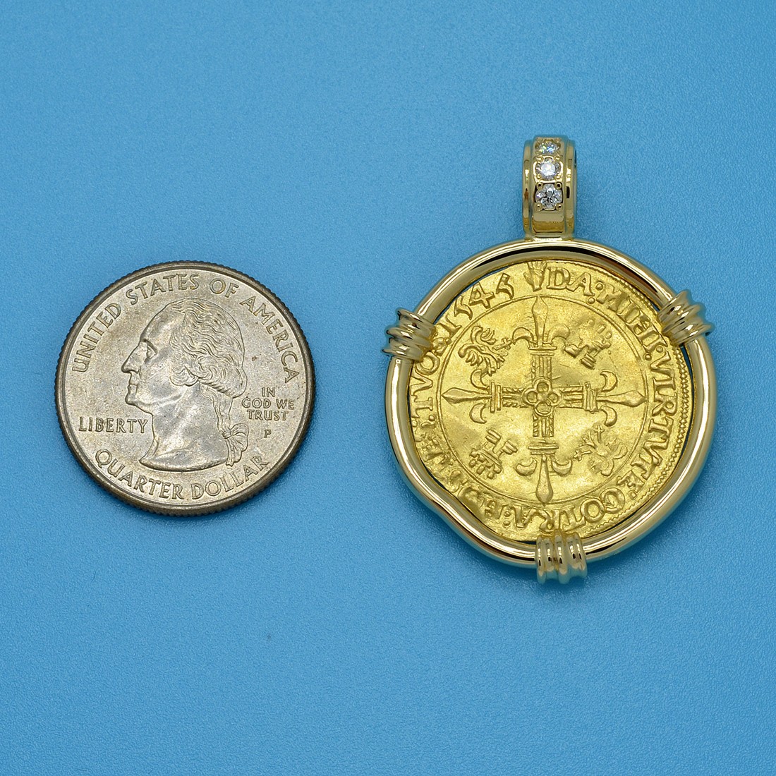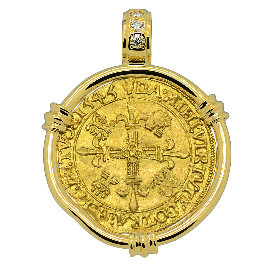 This rare 16th century gold corona del sol coin was minted in the Low Countries city of Antwerp during the rule of Holy Roman Emperor Charles V. Antwerp was a major shipping trade port in the state of the Duchy of Brabant, which was located in parts of present-day Belgium and the Netherlands.