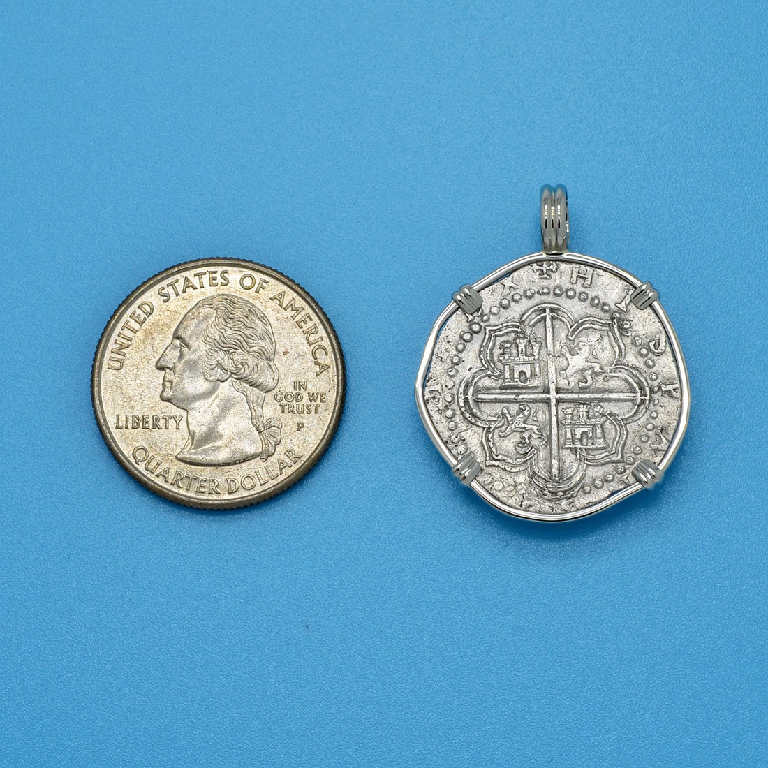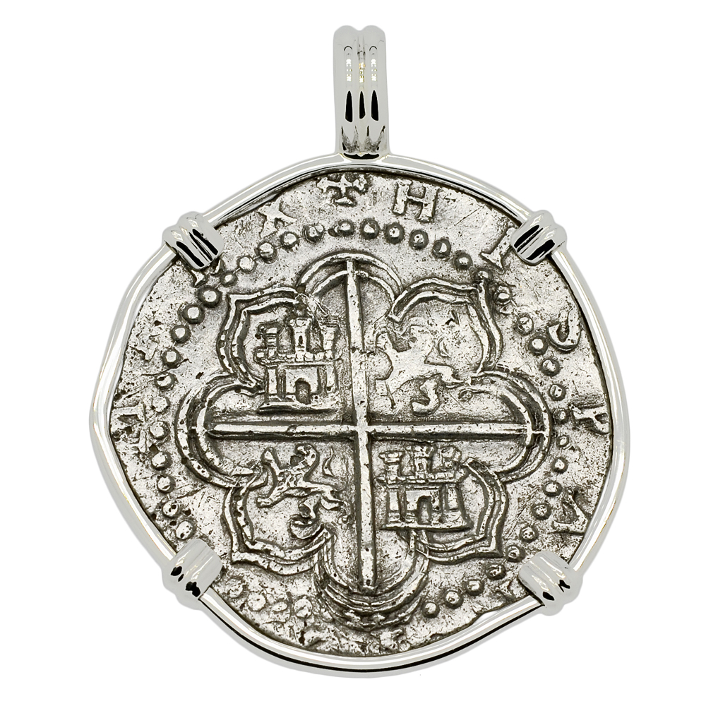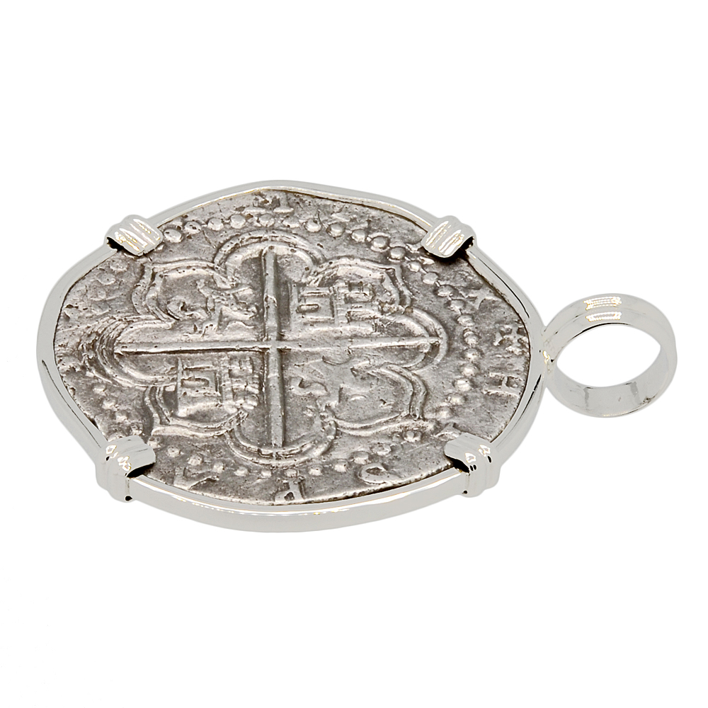 Spanish coins, known as "cobs", that circulated in this epic era were hand struck from dies and cut to weight. Minted in five denominations in silver, the largest was the eight reales, famous in the colonies and among pirates as a “Piece of Eight.” The other denominations were four reales, two reales, one real and half real. Cob coinage with their unusual shapes are all unique and each is a one-of-a-kind piece of history.