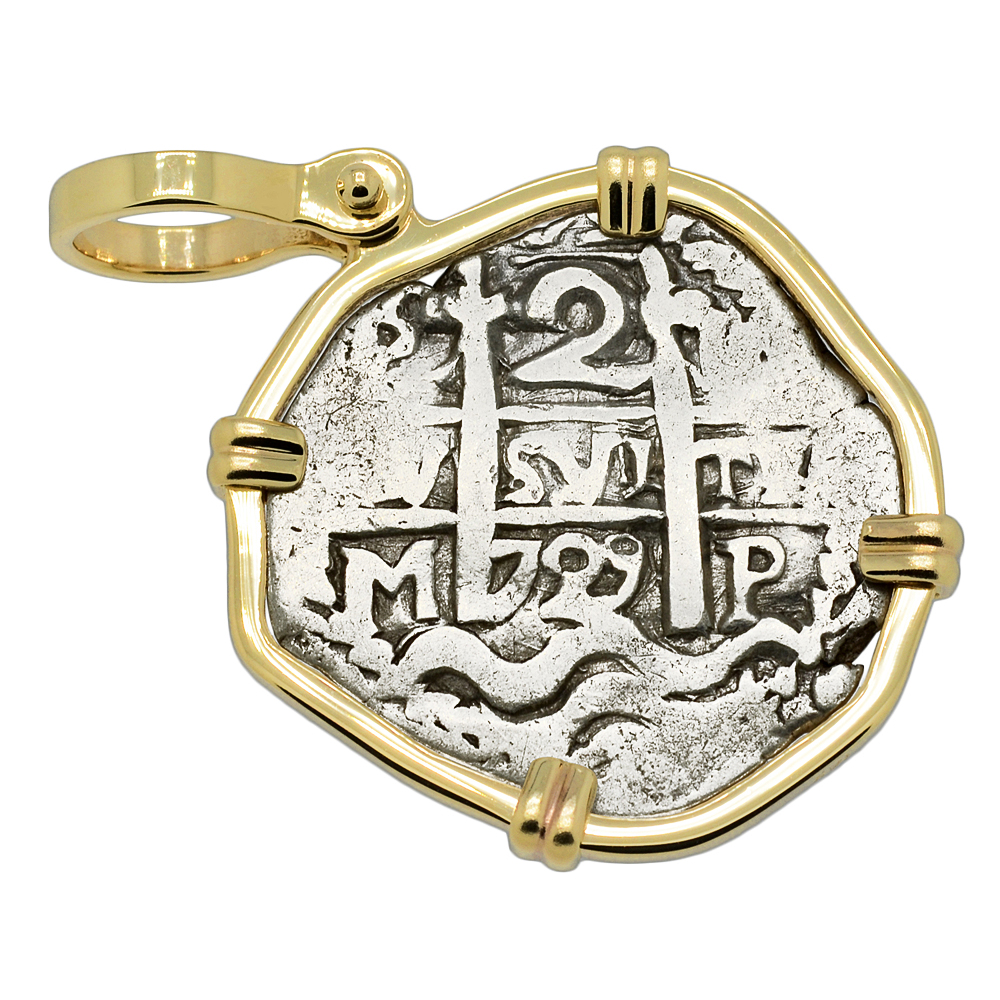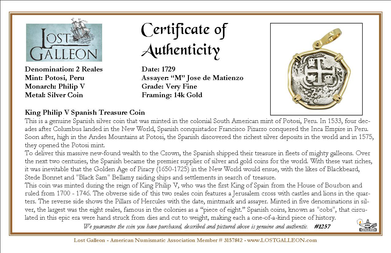 This coin was minted during the reign of King Philip V, who was the first King of Spain from the House of Bourbon and ruled from 1700 - 1746. The obverse side of this two reales coin features a Jerusalem cross with castles and lions in the quarters. The reverse side shows the Pillars of Hercules with the date, mintmark and assayer. Minted in five denominations in silver, the largest was the eight reales, famous in the colonies as a “piece of eight.” Spanish coins, known as "cobs", that circulated in this epic era were hand struck from dies and cut to weight, making each a one-of-a-kind piece of history.