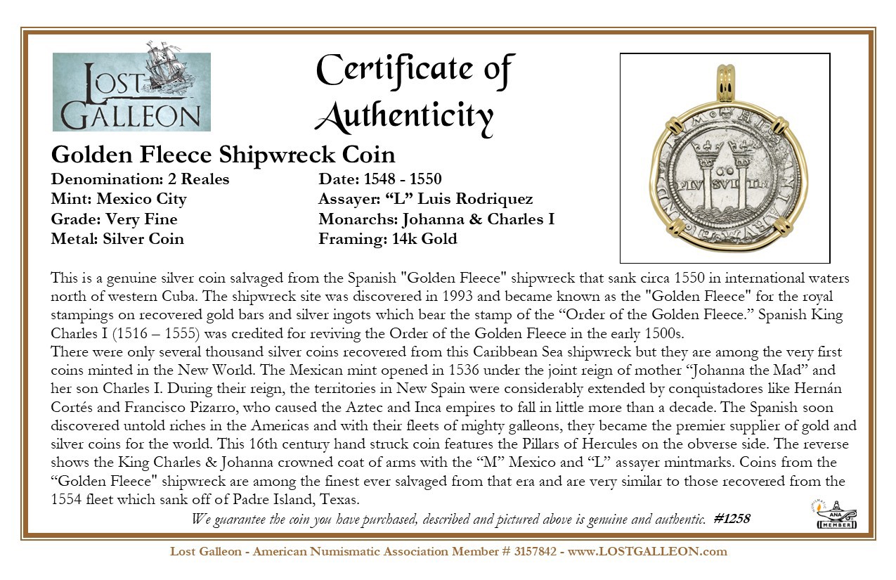 This is a genuine silver coin salvaged from the Spanish "Golden Fleece" shipwreck that sank circa 1550 in international waters north of western Cuba. The shipwreck site was discovered in 1993 and became known as the "Golden Fleece" for the royal stampings on recovered gold bars and silver ingots which bear the stamp of the “Order of the Golden Fleece.” Spanish King Charles I (1516 – 1555) was credited for reviving the Order of the Golden Fleece in the early 1500s.