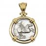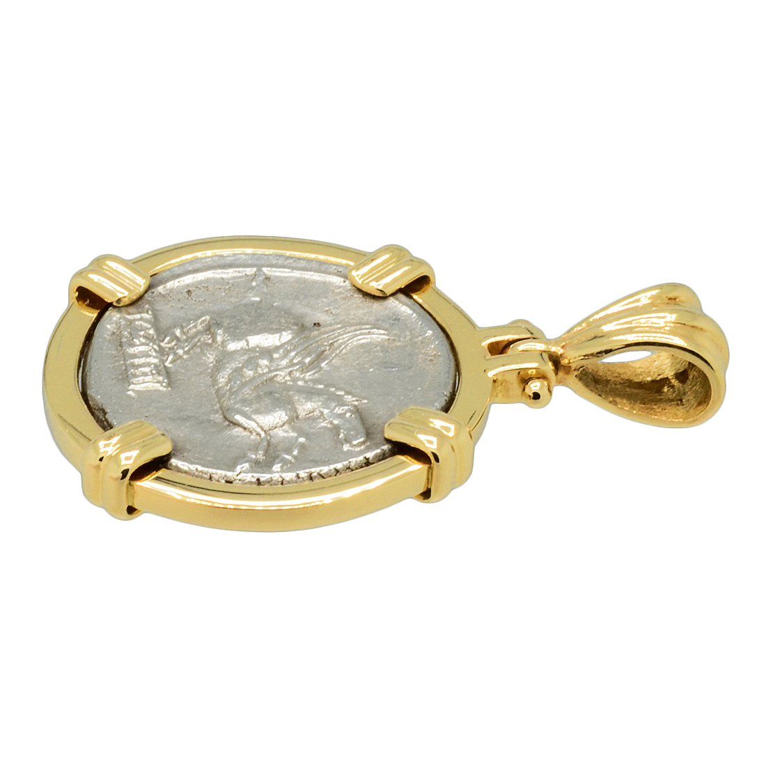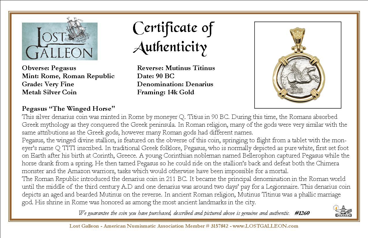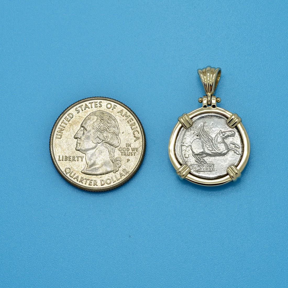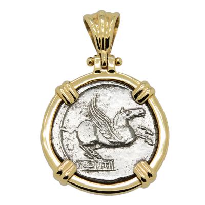 Pegasus, the winged divine stallion, is featured on the obverse of this coin, springing to flight from a tablet with the moneyer’s name Q TITI inscribed. In traditional Greek folklore, Pegasus, who is normally depicted as pure white, first set foot on Earth after his birth at Corinth, Greece. A young Corinthian nobleman named Bellerophon captured Pegasus while the horse drank from a spring. He then tamed Pegasus so he could ride on the stallion’s back and defeat both the Chimera monster and the Amazon warriors, tasks which would otherwise have been impossible for a mortal.