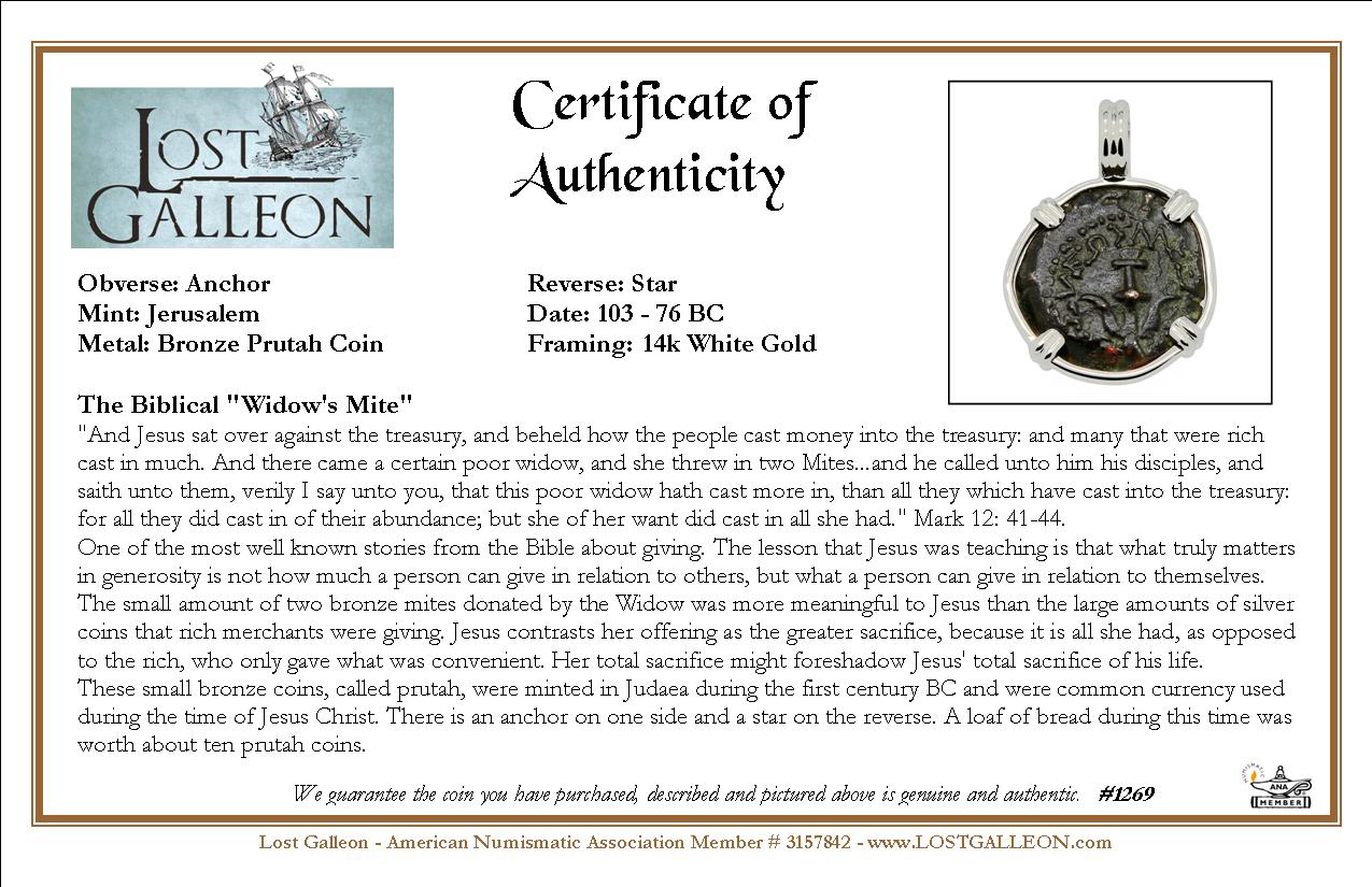 These small bronze coins, called prutah, were minted in Judaea during the first century BC and were common currency used during the time of Christ. There is an anchor on one side and a star on the reverse. A loaf of bread during this time was worth about ten prutah coins.