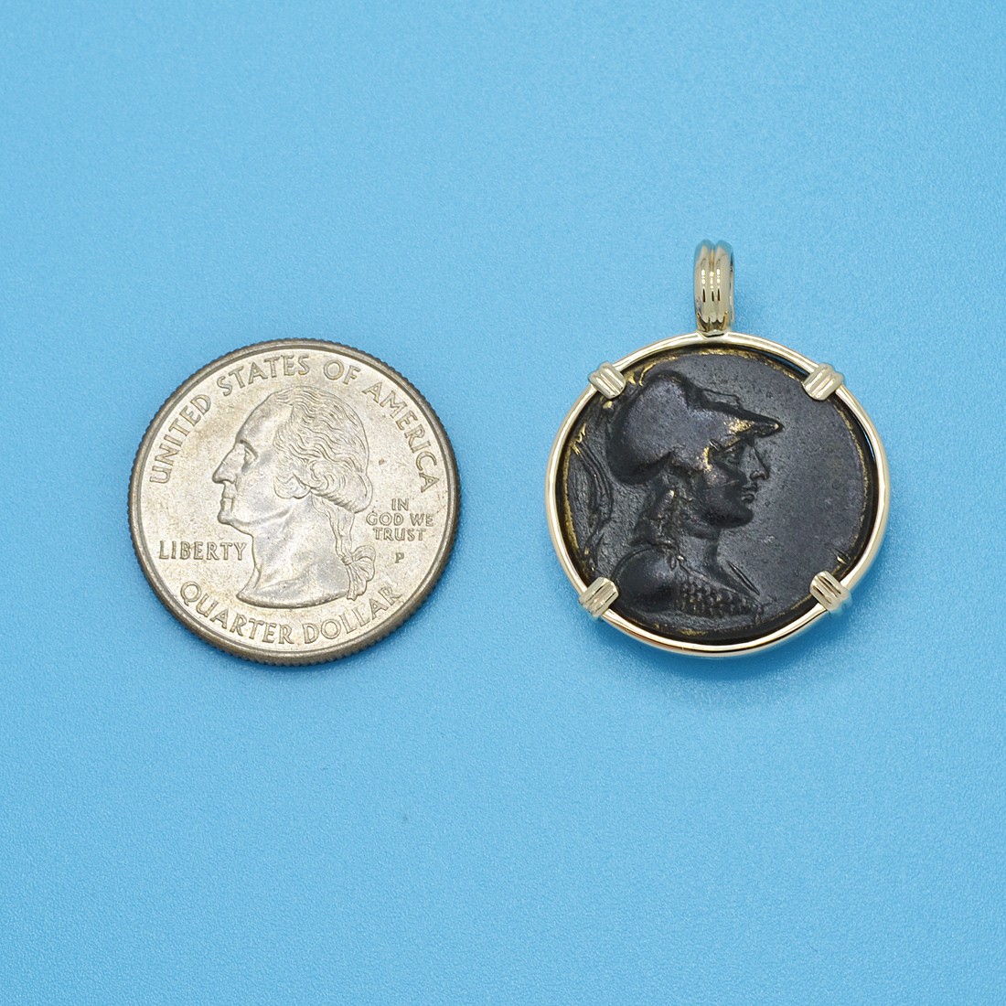 Athena is featured on this ancient coin wearing a high-crested Corinthian helmet and aegis. She was the Greek goddess of wisdom, peace, warfare, strategy, handicrafts and reason. Among her gifts to man were the inventions of the plow and the flute, the arts of taming animals, building ships along with making shoes. An armed warrior goddess, Athena appears in Greek mythology as a helper of many heroes, including Odysseus, Jason and Hercules.