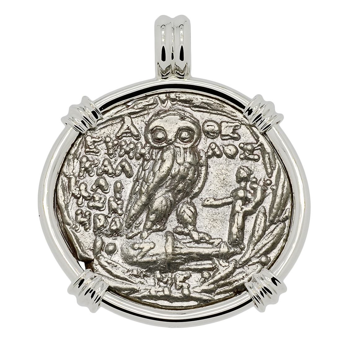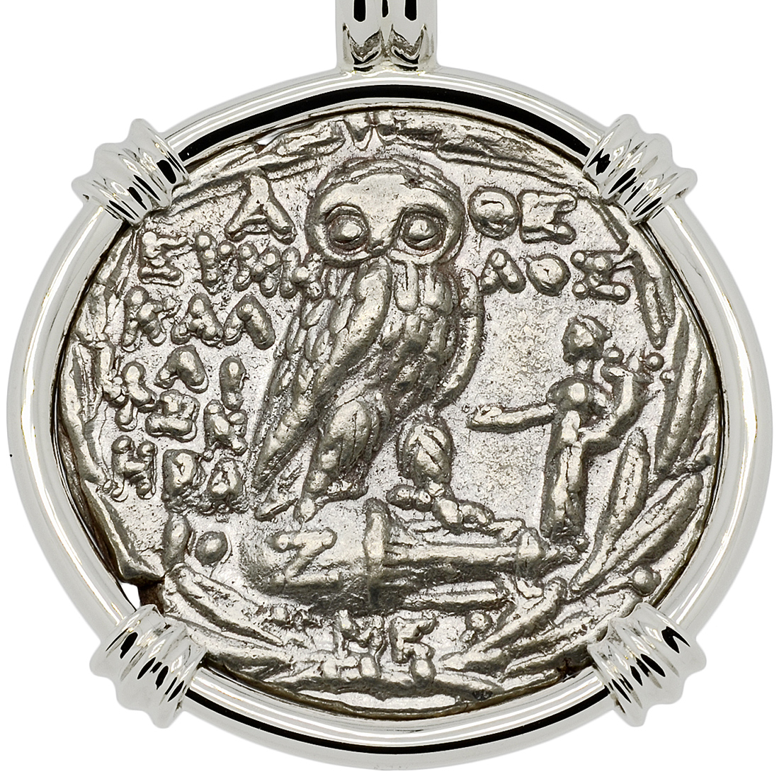 Athena was associated with birds and was often attended by her wise owl. This coin shows her owl standing on an amphora with goddess Tyche to the right and the Athens mint magistrates names Eumelos, Kalliphon, and Hera, all within a wreath.