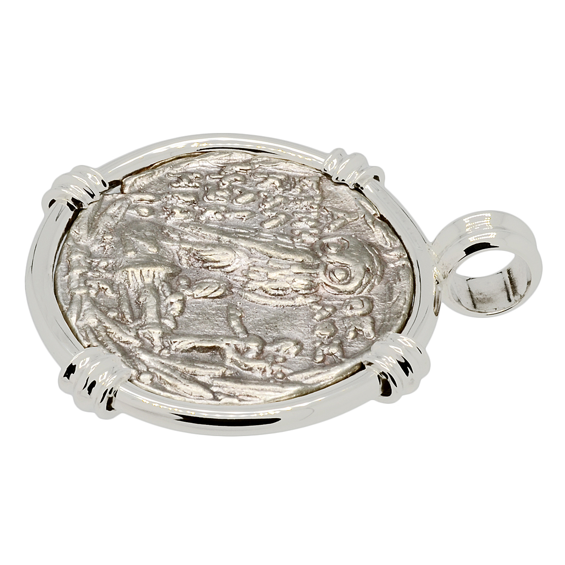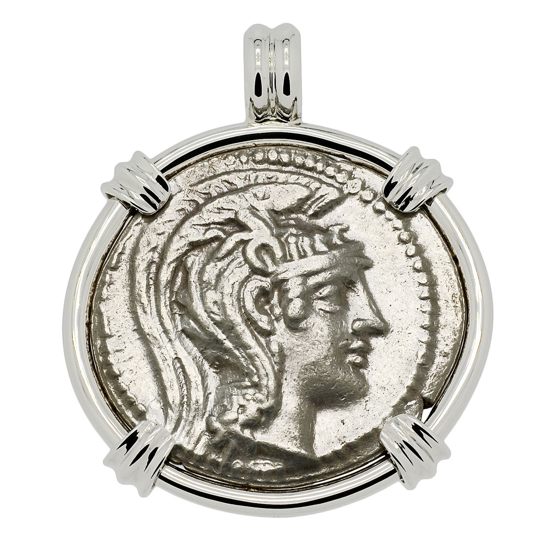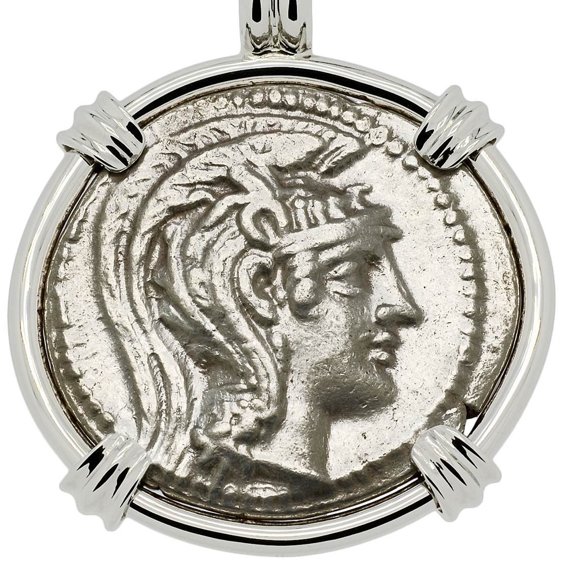 The reverse side of this ancient coin depicts the head of Athena, wearing a triple-crested Attic helmet decorated with four horses above the visor and Pegasus in flight above the raised earpiece. In Greek mythology, Athena was the goddess of wisdom, peace, warfare, strategy and reason. Her gifts to man were the inventions of the plow and the flute, the arts of taming animals, building ships along with making shoes. An armed warrior goddess, Athena appears in Greek mythology as a helper of many heroes, including Odysseus, Jason and Hercules. She never consorts with a lover, earning the title Athena Parthenos "Athena the Virgin", hence the name of her most famous temple, the Parthenon, on the Acropolis in Athens.