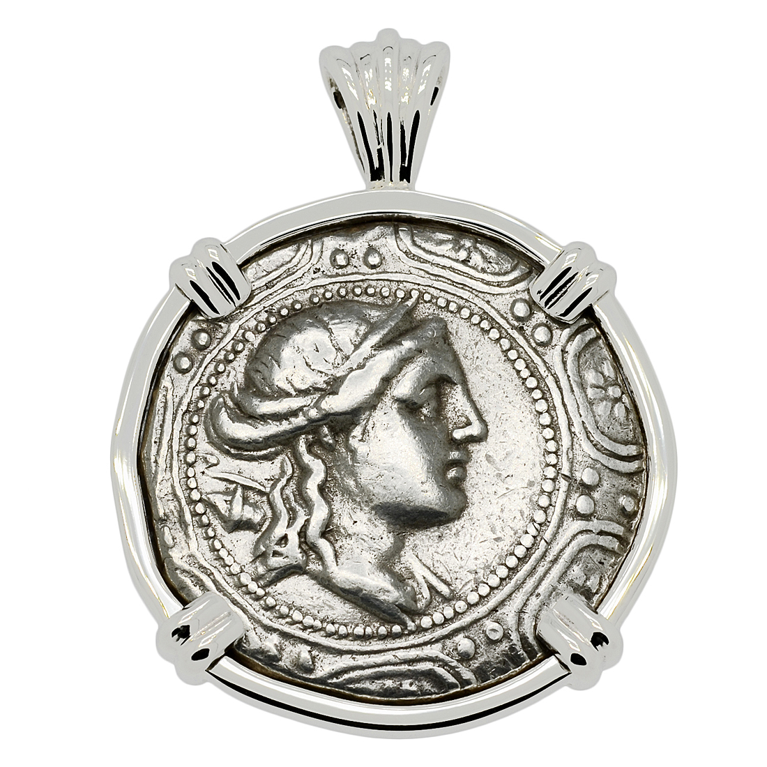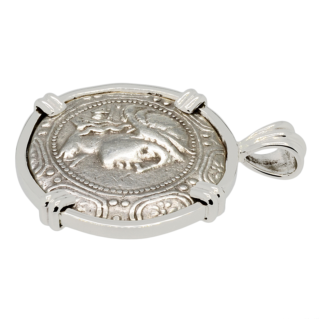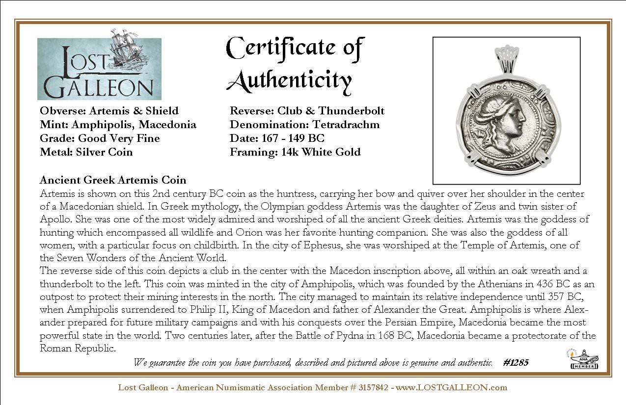 Artemis is shown on this 2nd century BC coin as the huntress, carrying her bow and quiver over her shoulder in the center of a Macedonian shield. In Greek mythology, the Olympian goddess Artemis was the daughter of Zeus and twin sister of Apollo. She was one of the most widely admired and worshiped of all the ancient Greek deities. Artemis was the goddess of hunting which encompassed all wildlife and Orion was her favorite hunting companion. She was also the goddess of all women, with a particular focus on childbirth. In the city of Ephesus, she was worshiped at the Temple of Artemis, one of the Seven Wonders of the Ancient World.