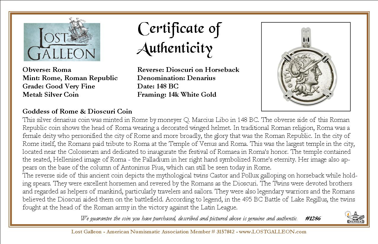 This silver denarius coin was minted in Rome by moneyer Q. Marcius Libo in 148 BC. The obverse side of this Roman Republic coin shows the head of Roma wearing a decorated winged helmet. In traditional Roman religion, Roma was a female deity who personified the city of Rome and more broadly, the glory that was the Roman Republic.