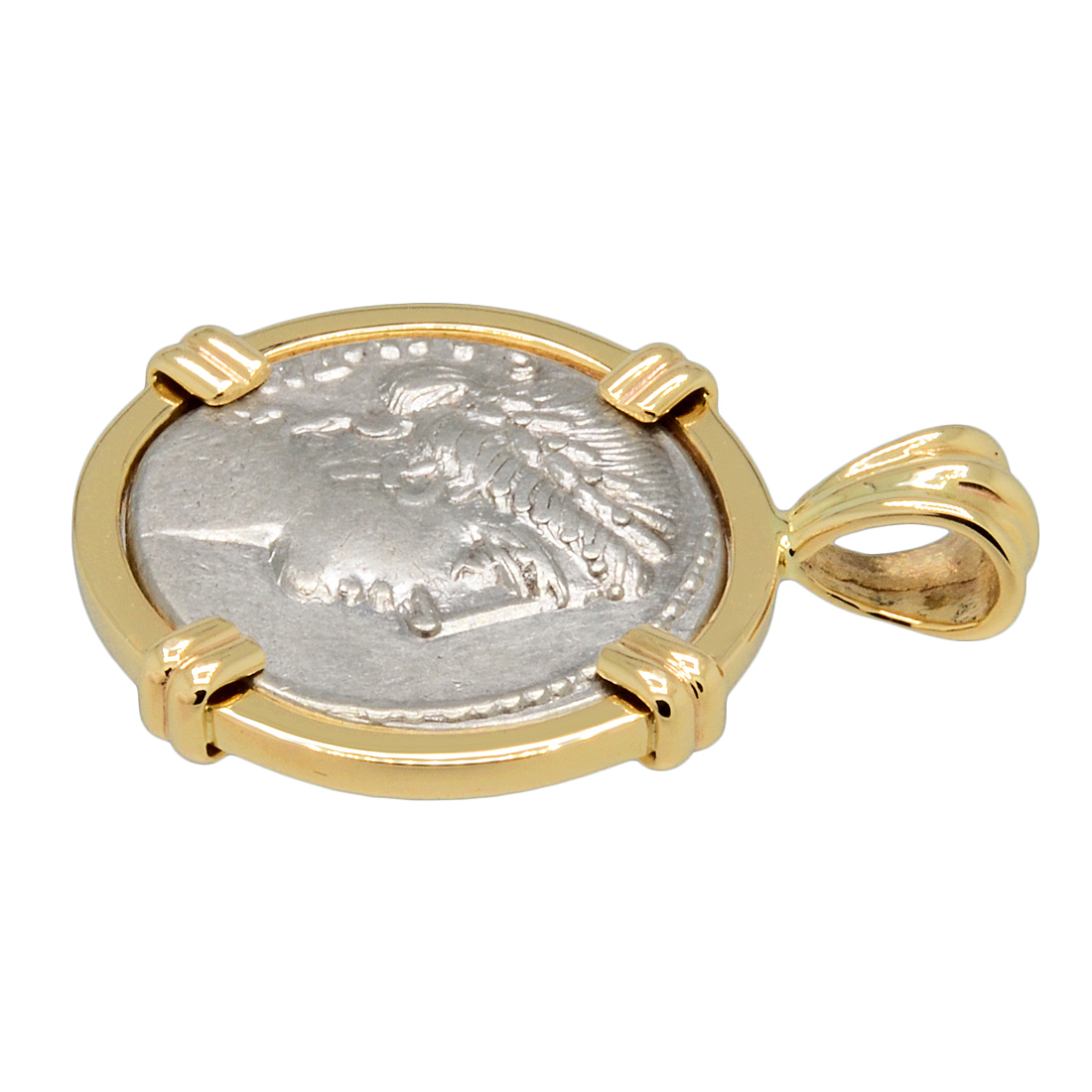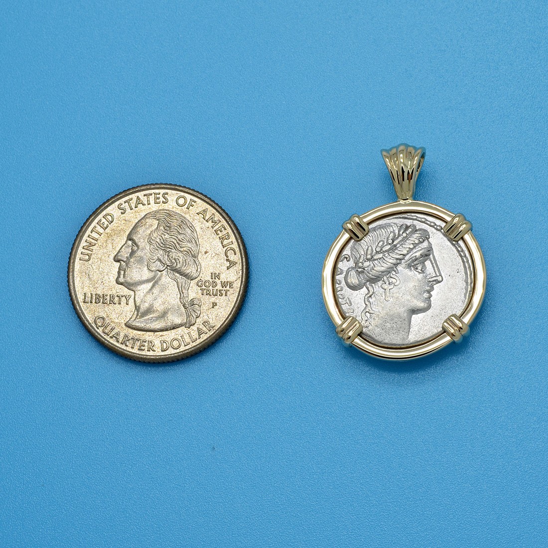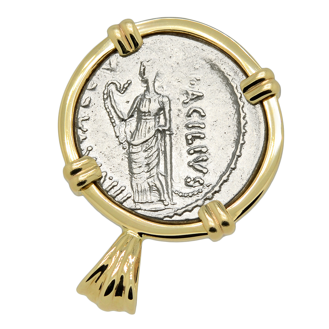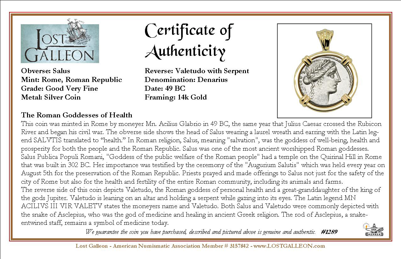 This coin was minted in Rome by moneyer Mn. Acilius Glabrio in 49 BC, the same year that Julius Caesar crossed the Rubicon River and began his civil war. The obverse side shows the head of Salus wearing a laurel wreath and earring with the Latin legend SALVTIS translated to “health.” In Roman religion, Salus, meaning "salvation", was the goddess of well-being, health and prosperity for both the people and the Roman Republic.