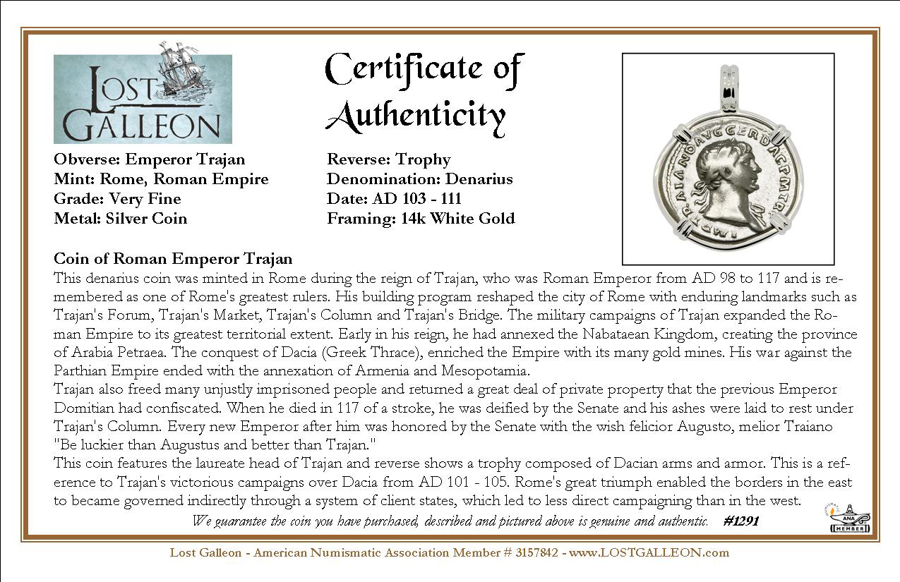 This denarius coin was minted in Rome during the reign of Trajan, who was Roman Emperor from AD 98 to 117 and is remembered as one of Rome's greatest rulers. His building program reshaped the city of Rome with enduring landmarks such as Trajan's Forum, Trajan's Market, Trajan's Column and Trajan's Bridge. The military campaigns of Trajan expanded the Roman Empire to its greatest territorial extent. Early in his reign, he had annexed the Nabataean Kingdom, creating the province of Arabia Petraea. The conquest of Dacia (Greek Thrace), enriched the Empire with its many gold mines. His war against the Parthian Empire ended with the annexation of Armenia and Mesopotamia.