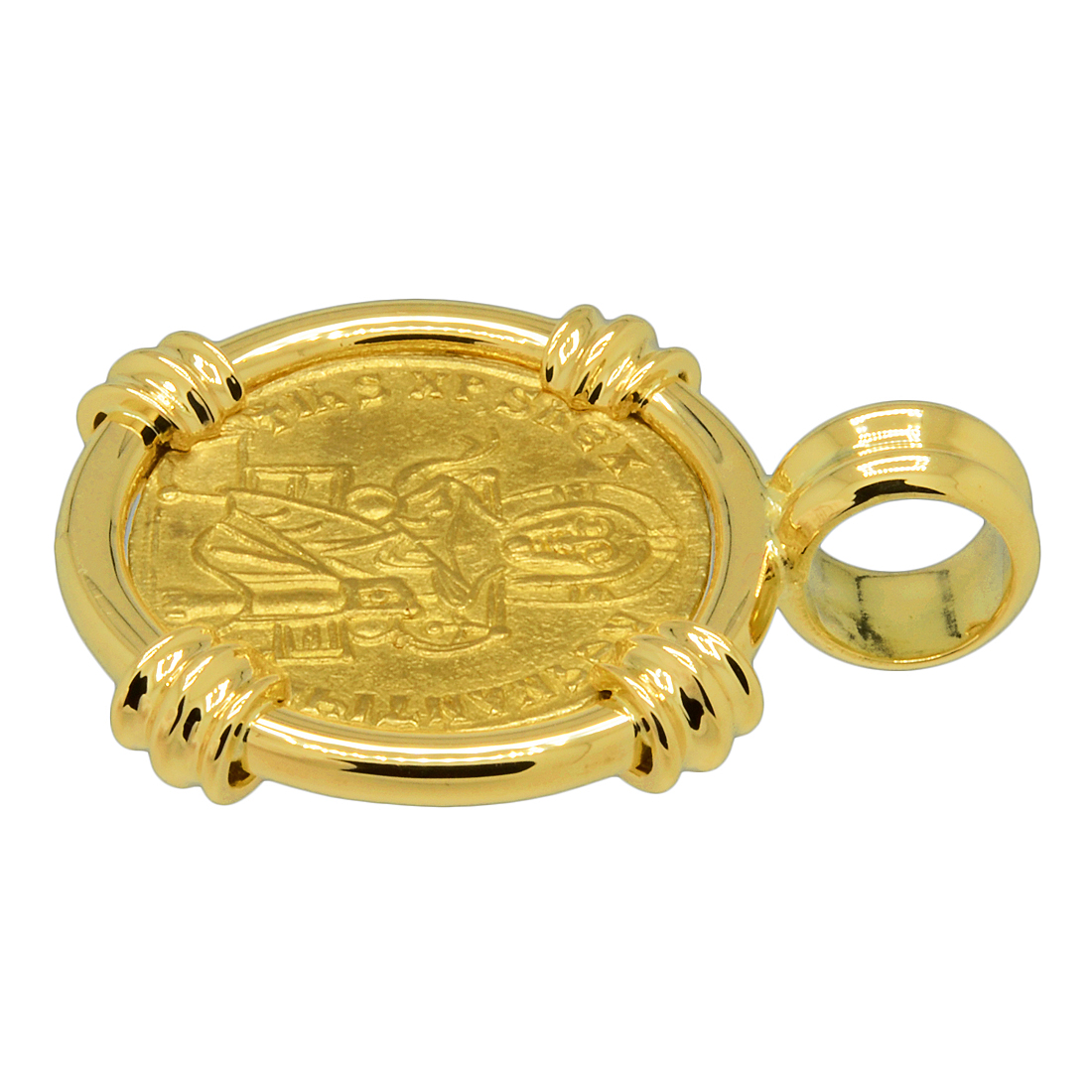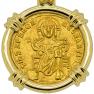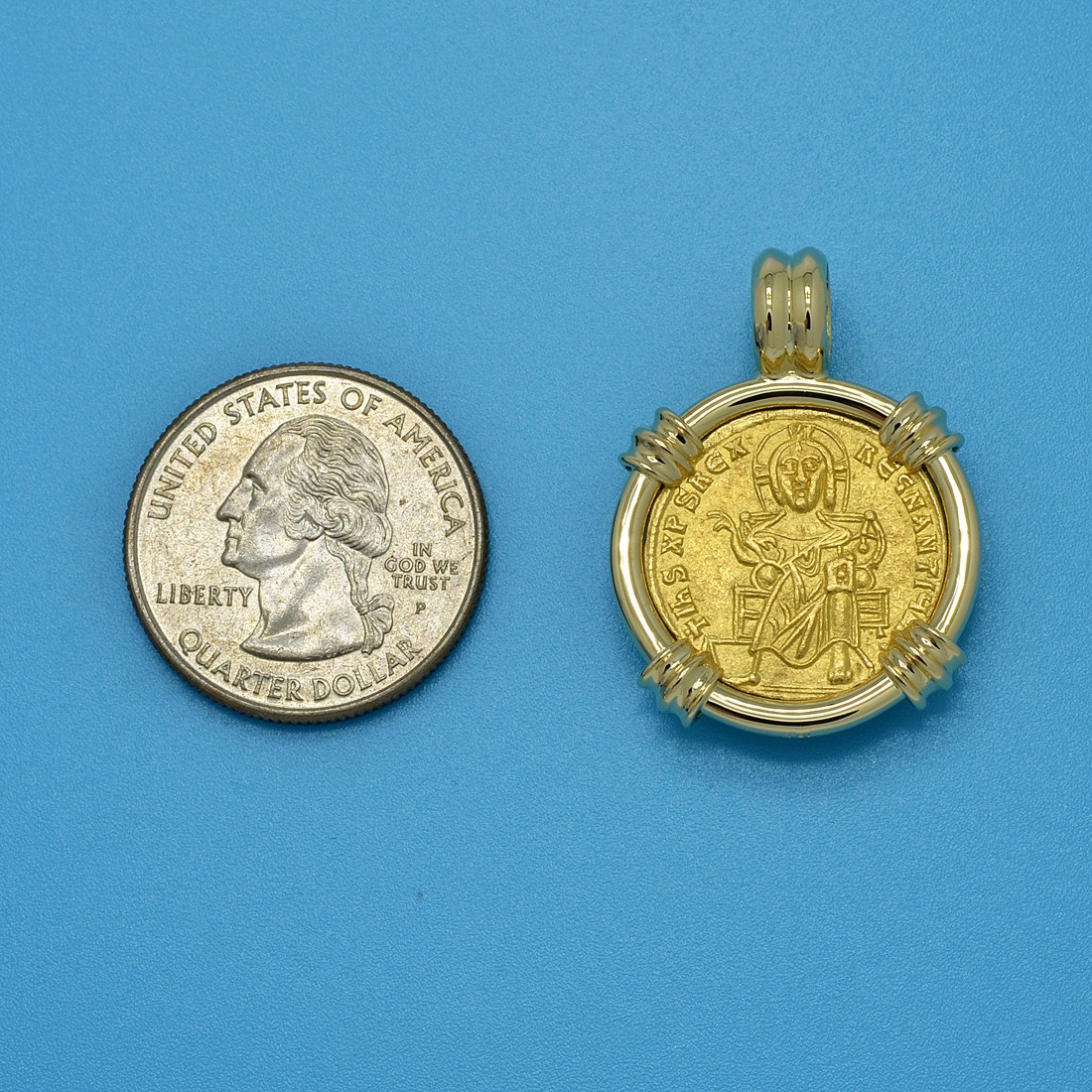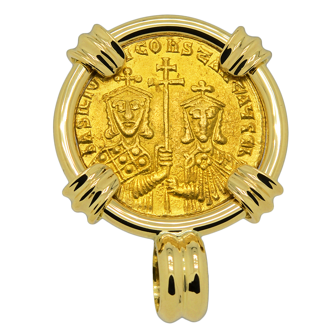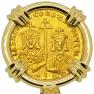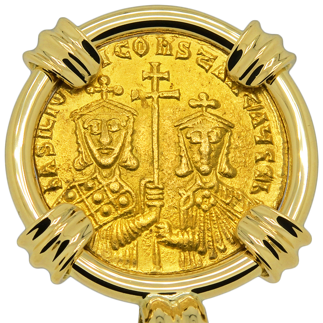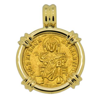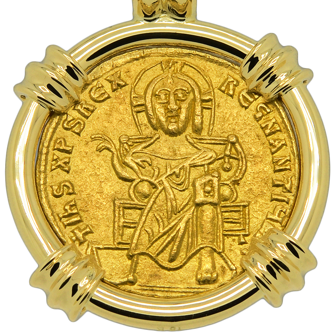 This 9th century Byzantine gold solidus features Jesus Christ Pantokrator “Christ in Majesty.” Jesus is shown enthroned, wearing a chilton, while raising his right hand in benediction and holding the Book of Gospels in his left hand. The Latin inscription IҺS XPS RЄX RЄGNANTIЧM translates to "Jesus Christ King of Kings." The reverse shows the crowned Emperors Basil I and his son Constantine, holding a patriarchal cross between them.
