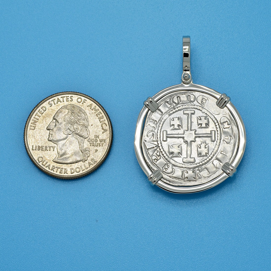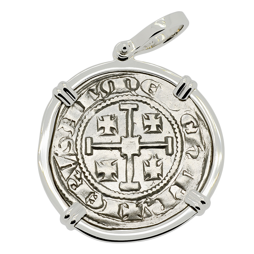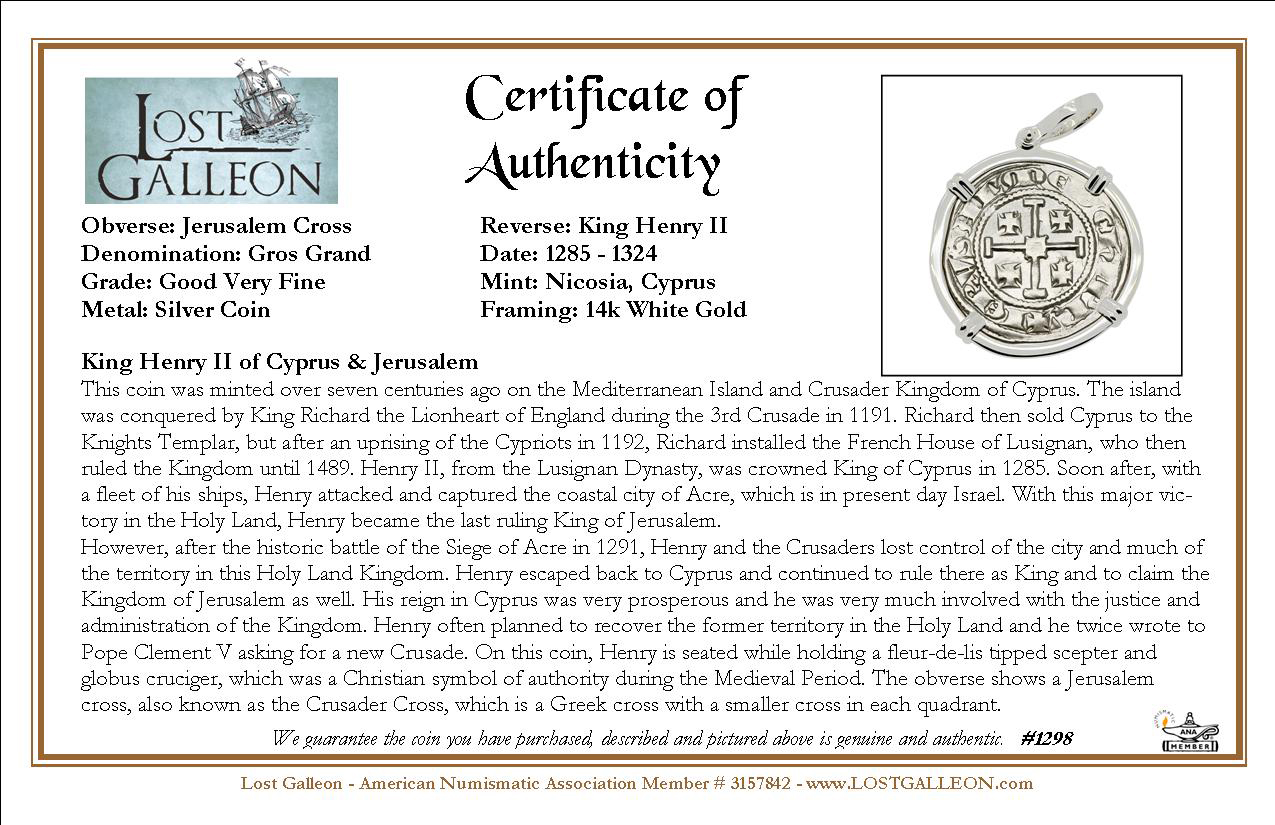 This coin was minted over seven centuries ago on the Mediterranean Island and Crusader Kingdom of Cyprus. The island was conquered by King Richard the Lionheart of England during the 3rd Crusade in 1191. Richard then sold Cyprus to the Knights Templar, but after an uprising of the Cypriots in 1192, Richard installed the French House of Lusignan, who then ruled the Kingdom until 1489. Henry II, from the Lusignan Dynasty, was crowned King of Cyprus in 1285. Soon after, with a fleet of his ships, Henry attacked and captured the coastal city of Acre, which is in present day Israel. With this major victory in the Holy Land, Henry became the last ruling King of Jerusalem.