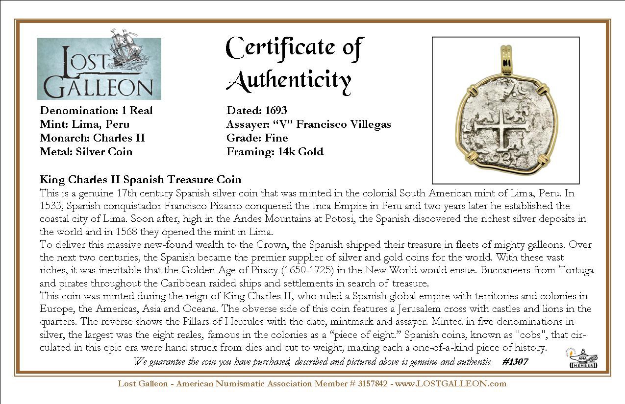 This is a genuine 17th century Spanish silver coin that was minted in the colonial South American mint of Lima, Peru. In 1533, Spanish conquistador Francisco Pizarro conquered the Inca Empire in Peru and two years later he established the coastal city of Lima. Soon after, high in the Andes Mountains at Potosi, the Spanish discovered the richest silver deposits in the world and in 1568 they opened the mint in Lima.