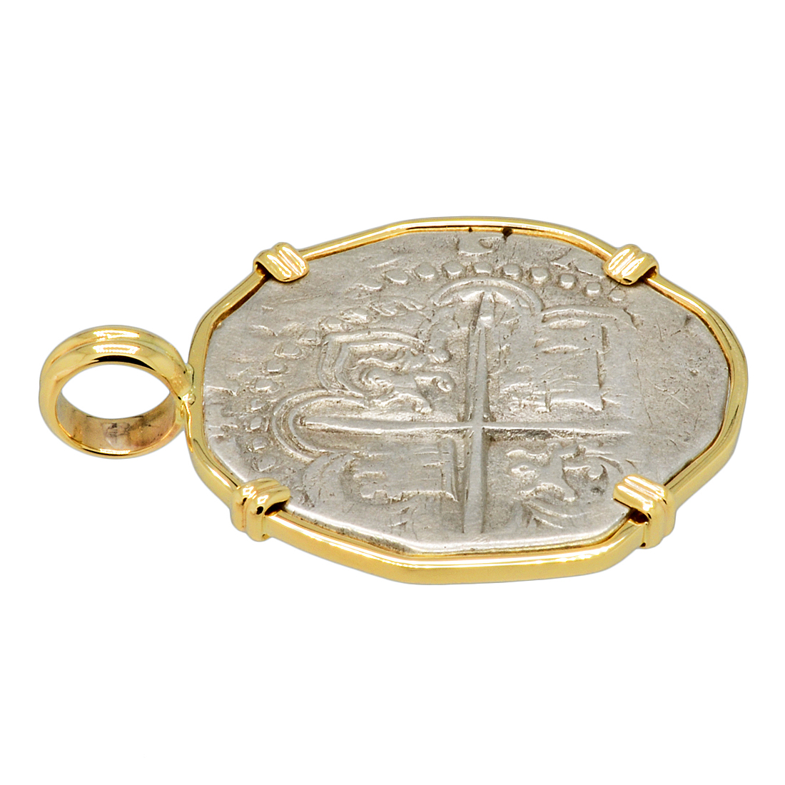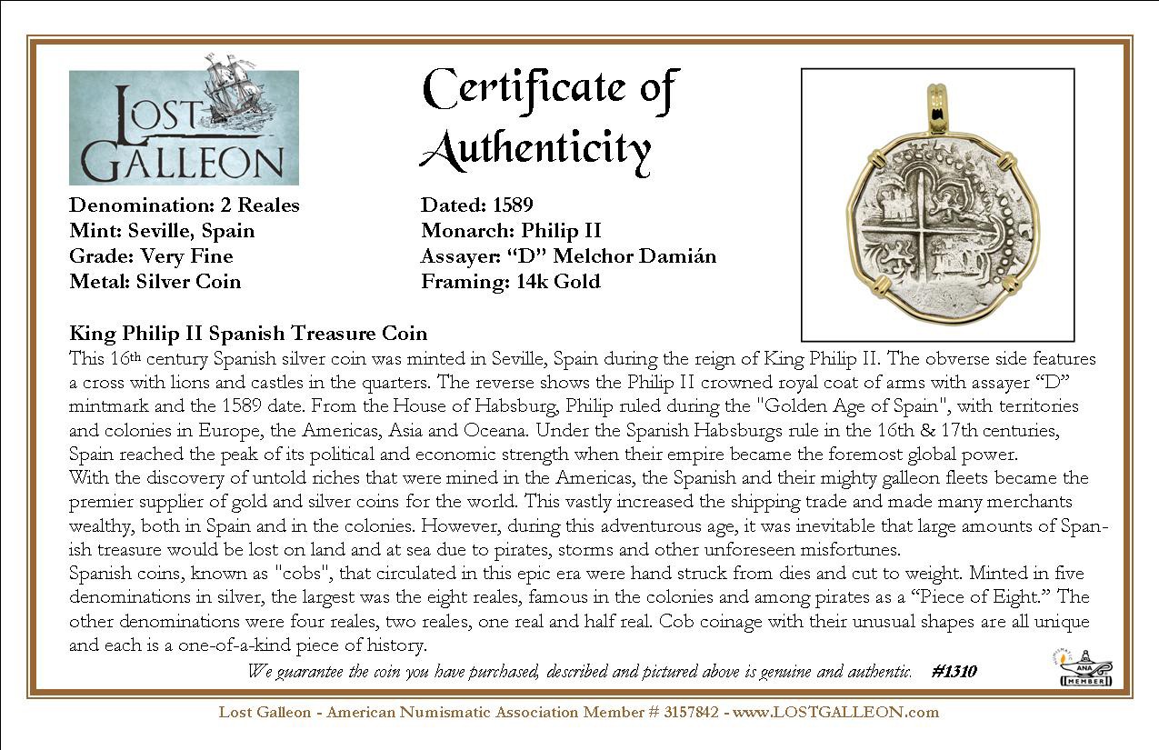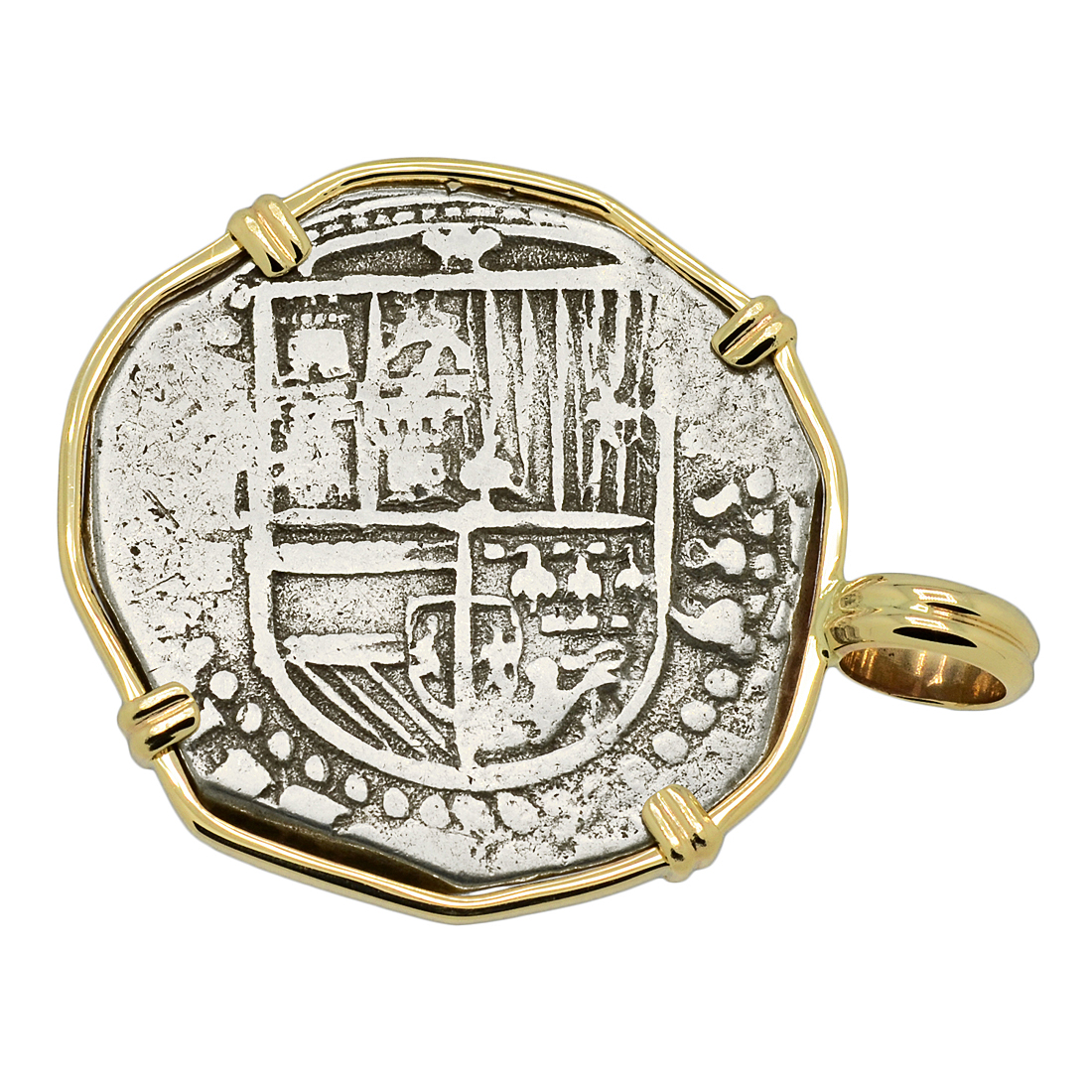 This 16th century Spanish silver coin was minted in Seville, Spain during the reign of King Philip II. The obverse side features a cross with lions and castles in the quarters. The reverse shows the Philip II crowned royal coat of arms with assayer “D” mintmark and the 1589 date. From the House of Habsburg, Philip ruled during the "Golden Age of Spain", with territories and colonies in Europe, the Americas, Asia and Oceana. Under the Spanish Habsburgs rule in the 16th & 17th centuries, Spain reached the peak of its political and economic strength when their empire became the foremost global power.