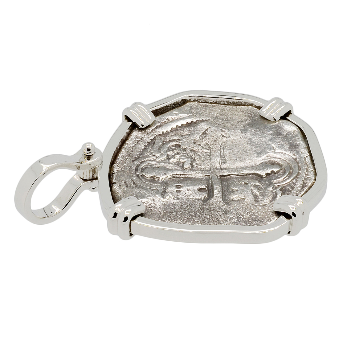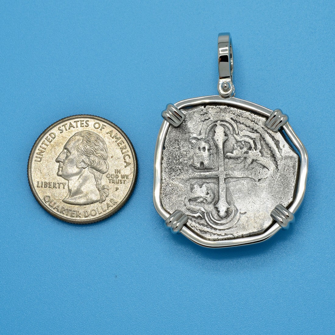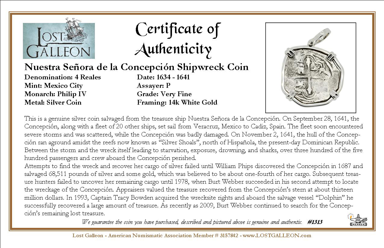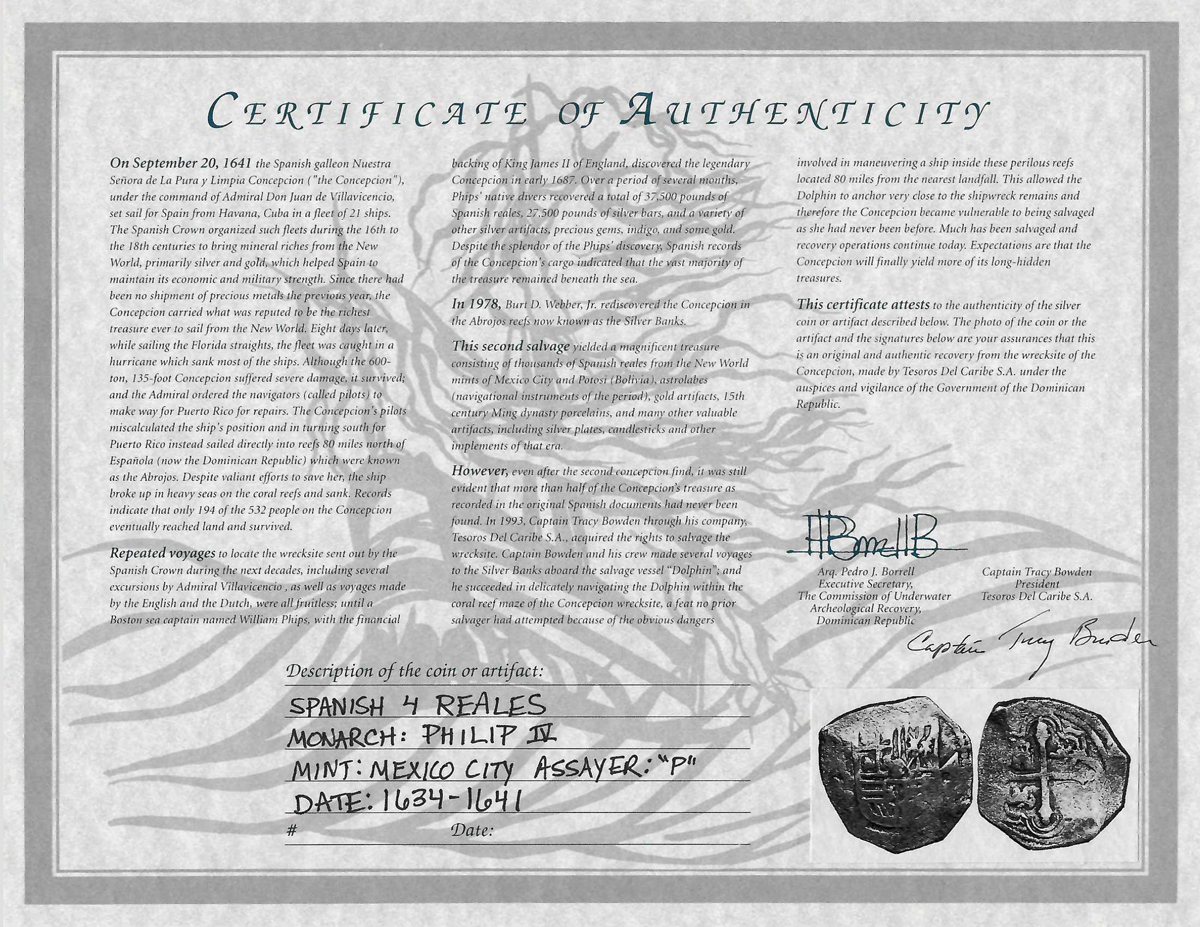 Salvagers certificate included. This is a genuine silver coin salvaged from the treasure ship Nuestra Señora de la Concepción. On September 28, 1641, the Concepción, along with a fleet of 20 other ships, set sail from Veracruz, Mexico to Cadiz, Spain. The fleet soon encountered severe storms and was scattered, while the Concepción was badly damaged. On November 2, 1641, the hull of the Concepción ran aground amidst the reefs now known as “Silver Shoals”, north of Hispañola, the present-day Dominican Republic. Between the storm and the wreck itself leading to starvation, exposure, drowning, and sharks, over three hundred of the five hundred passengers and crew aboard the Concepción perished.