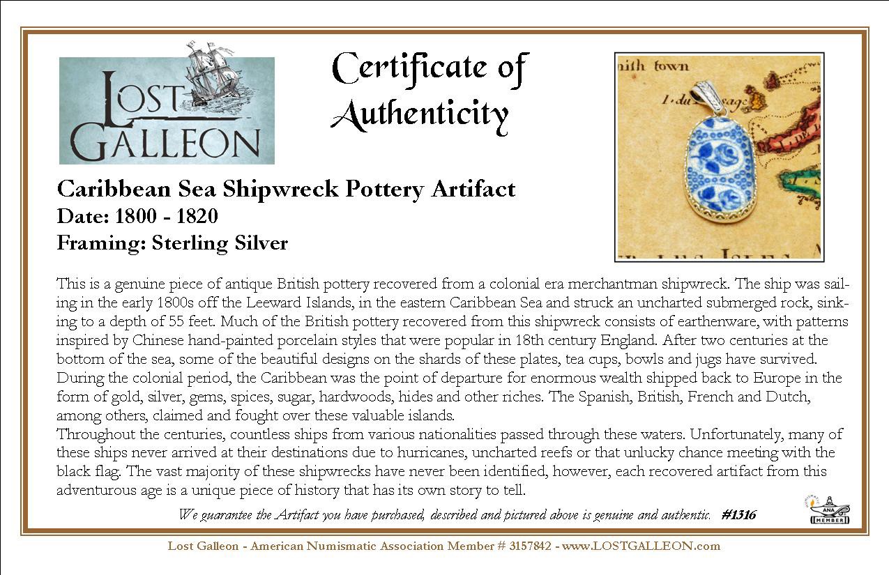 This is a genuine piece of antique British pottery recovered from a colonial era merchantman shipwreck. The ship was sailing in the early 1800s off the Leeward Islands, in the eastern Caribbean Sea and struck an uncharted submerged rock, sinking to a depth of 55 feet. Much of the British pottery recovered from this shipwreck consists of earthenware, with patterns inspired by Chinese hand-painted porcelain styles that were popular in 18th century England. After two centuries at the bottom of the sea, some of the beautiful designs on the shards of these plates, tea cups, bowls and jugs have survived.