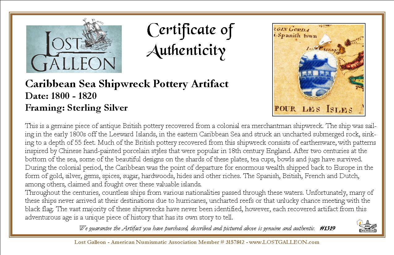 This is a genuine piece of antique British pottery recovered from a colonial era merchantman shipwreck. The ship was sailing in the early 1800s off the Leeward Islands, in the eastern Caribbean Sea and struck an uncharted submerged rock, sinking to a depth of 55 feet. Much of the British pottery recovered from this shipwreck consists of earthenware, with patterns inspired by Chinese hand-painted porcelain styles that were popular in 18th century England. After two centuries at the bottom of the sea, some of the beautiful designs on the shards of these plates, tea cups, bowls and jugs have survived.