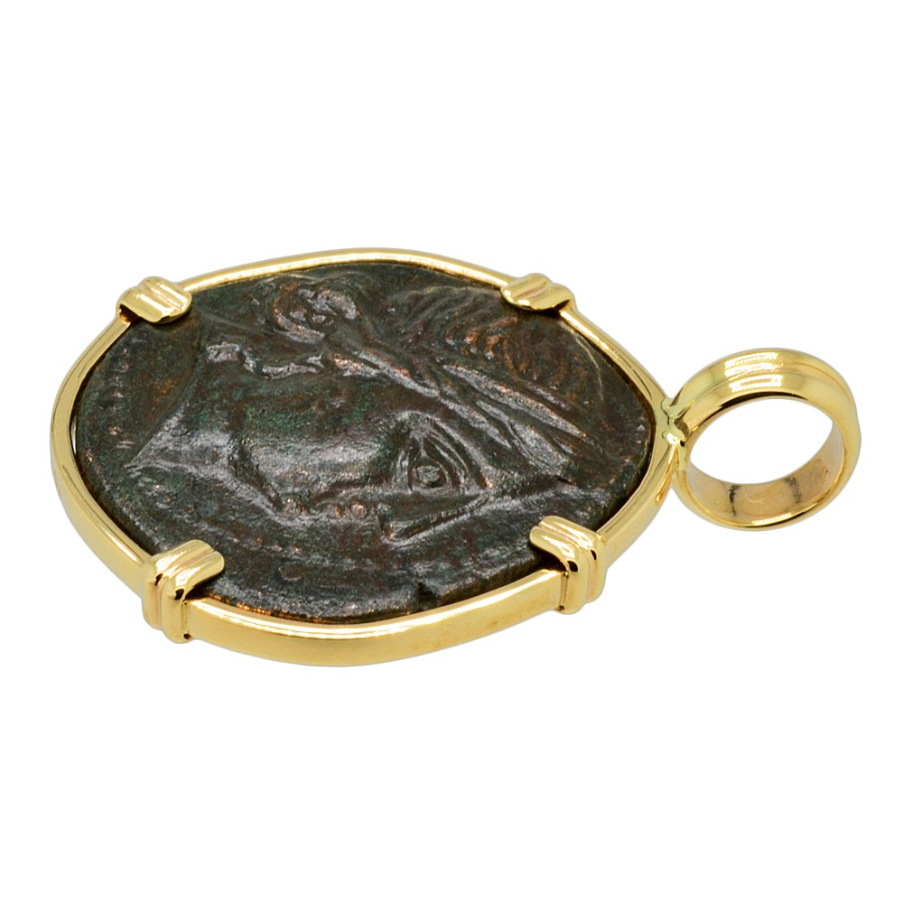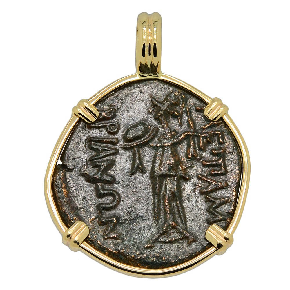 Athena, brandishing a spear and holding a shield, is shown on the reverse of this coin. Athena was the goddess of wisdom, peace, warfare, strategy and reason. An armed warrior goddess, Athena appears in Greek mythology as a helper of many heroes, including Odysseus, Jason and Hercules.