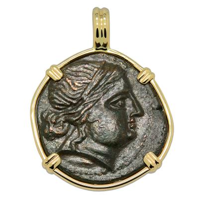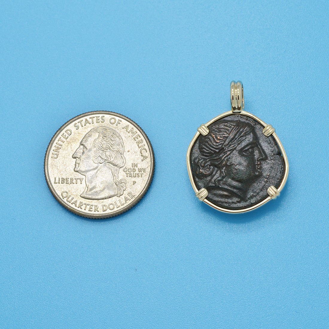 The obverse of this bronze coin features the head of an Amazon. In Greek mythology, the Amazons were a tribe of warrior women from the south coast of the Black Sea who were famous for their riding skills, courage and pride. Two of the most famous Amazon Queens were both daughters of Ares, the god of war. Queen Penthesilea, fought in the Trojan War and was killed by Achilles, but after taking off her helmet, Achilles falls in love with Penthesilea. In another epic story, her sister Queen Hippolyta possessed a magical girdle that was sought after by Hercules in his ninth labour. Amazon warriors were often depicted in battle with Greek heroes and according to legend, the Amazons invented the cavalry.