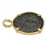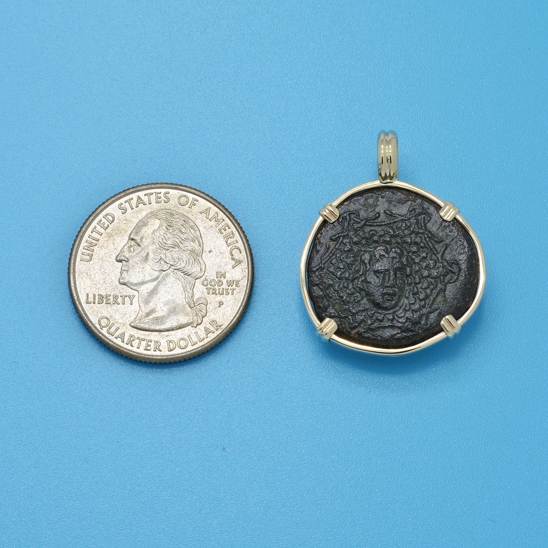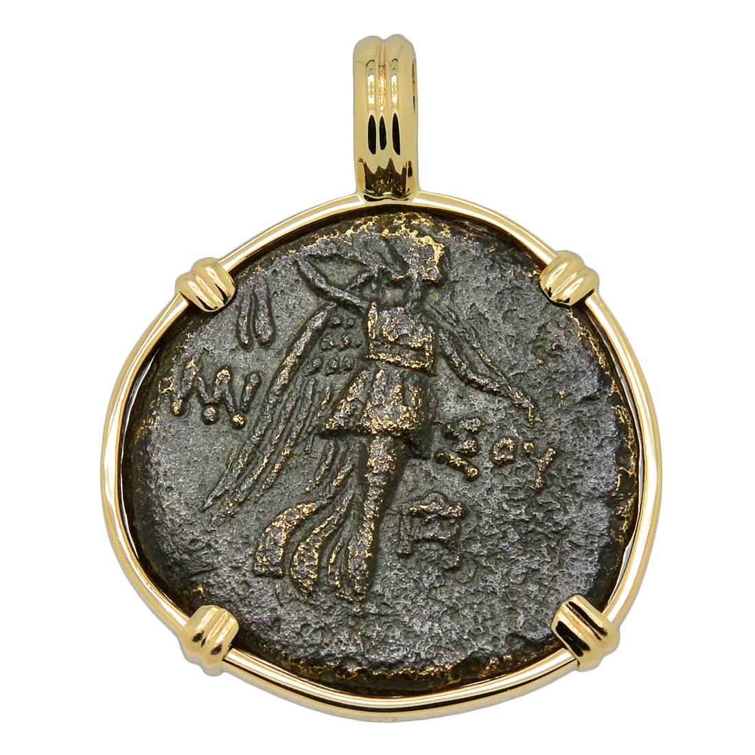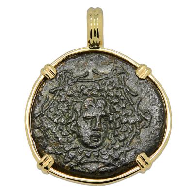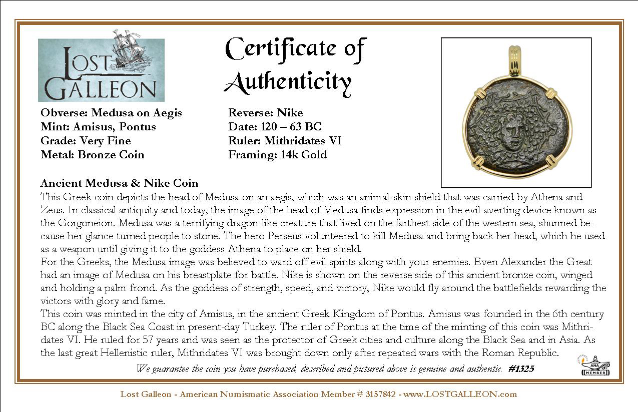 For the Greeks, the Medusa image was believed to ward off evil spirits along with your enemies. Even Alexander the Great had an image of Medusa on his breastplate for battle. Nike is shown on the reverse side of this ancient bronze coin, winged and holding a palm frond. As the goddess of strength, speed, and victory, Nike would fly around the battlefields rewarding the victors with glory and fame.