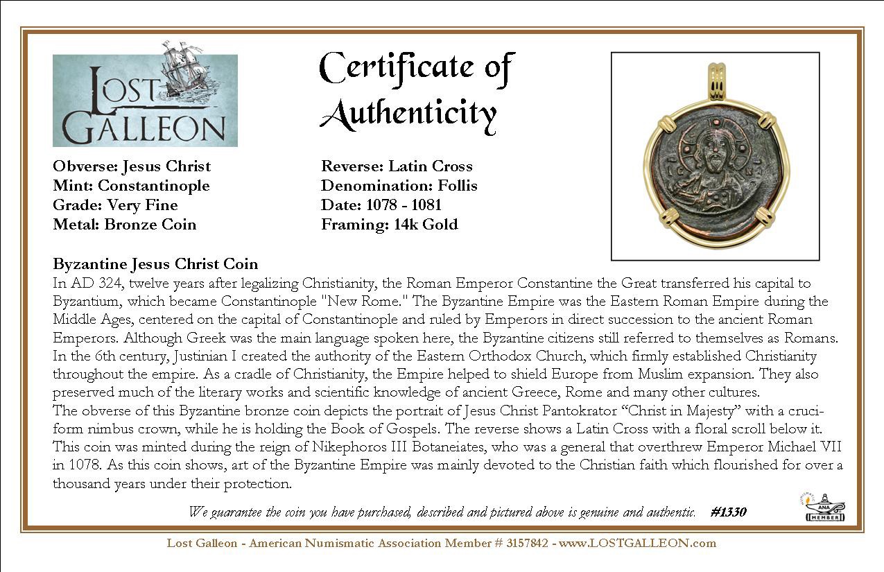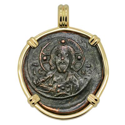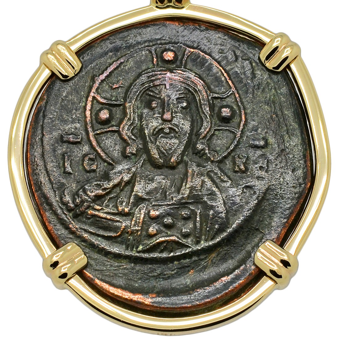 The obverse of this Byzantine bronze coin depicts the portrait of Jesus Christ Pantokrator “Christ in Majesty” with a cruciform nimbus crown, while he is holding the Book of Gospels. The reverse shows a Latin Cross with a floral scroll below it. This coin was minted during the reign of Nikephoros III Botaneiates, who was a general that overthrew Emperor Michael VII in 1078. As this coin shows, art of the Byzantine Empire was mainly devoted to the Christian faith which flourished for over a thousand years under their protection.