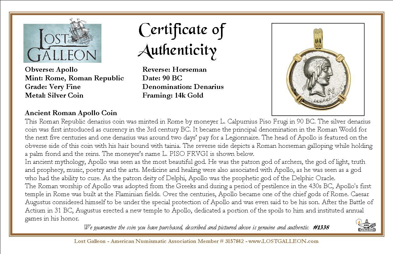This Roman Republic denarius coin was minted in Rome by moneyer L. Calpurnius Piso Frugi in 90 BC. The silver denarius coin was first introduced as currency in the 3rd century BC. It became the principal denomination in the Roman World for the next five centuries and one denarius was around two days’ pay for a Legionnaire. The head of Apollo is featured on the obverse side of this coin with his hair bound with tainia. The reverse side depicts a Roman horseman galloping while holding a palm frond and the reins. The moneyer’s name L. PISO FRVGI is shown below.