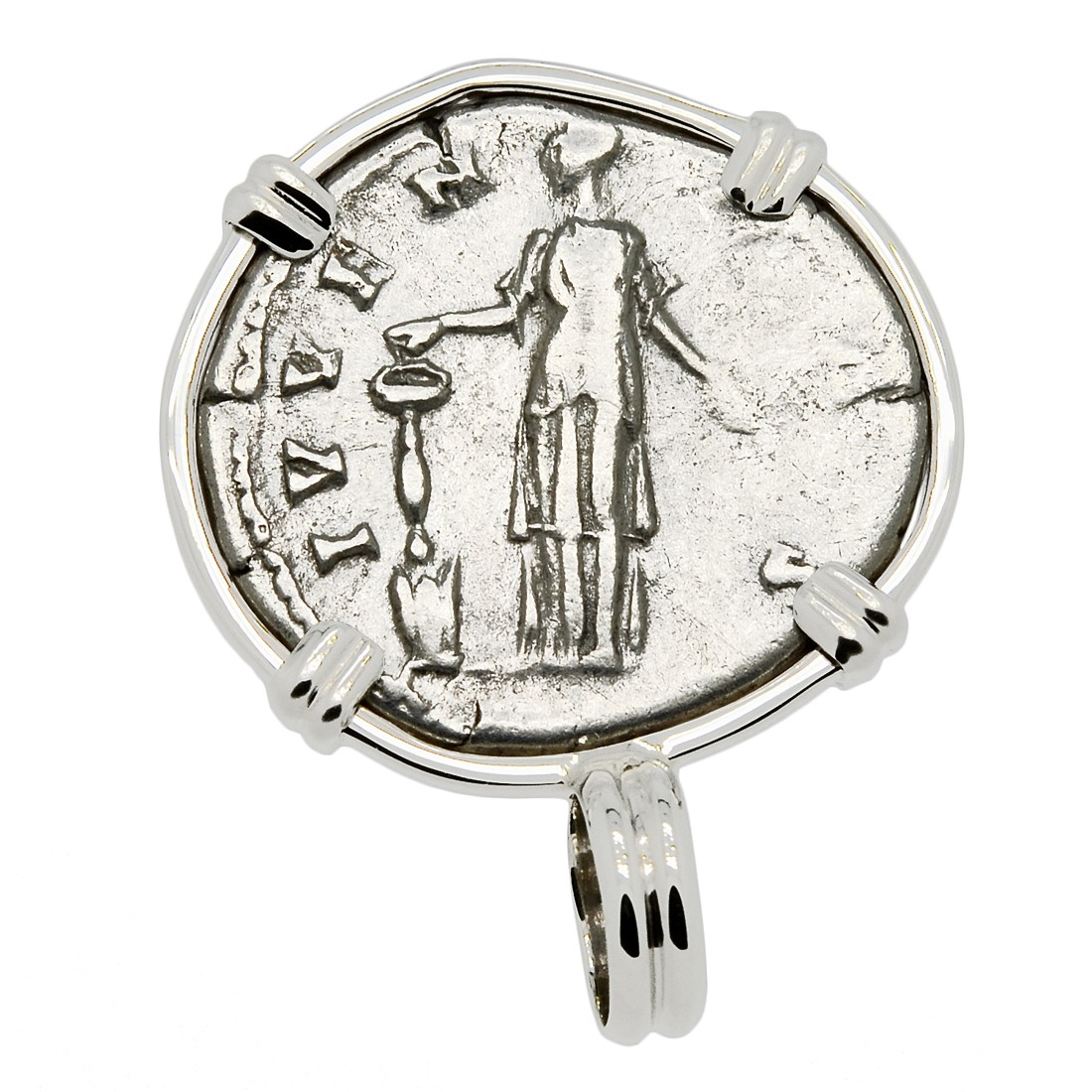 The reverse of this coin shows Juventas holding a patera and dropping incense on a candelabrum. Juventas was the guardian goddess of young men and she was mainly worshipped when they approached manhood and assumed responsibilities.