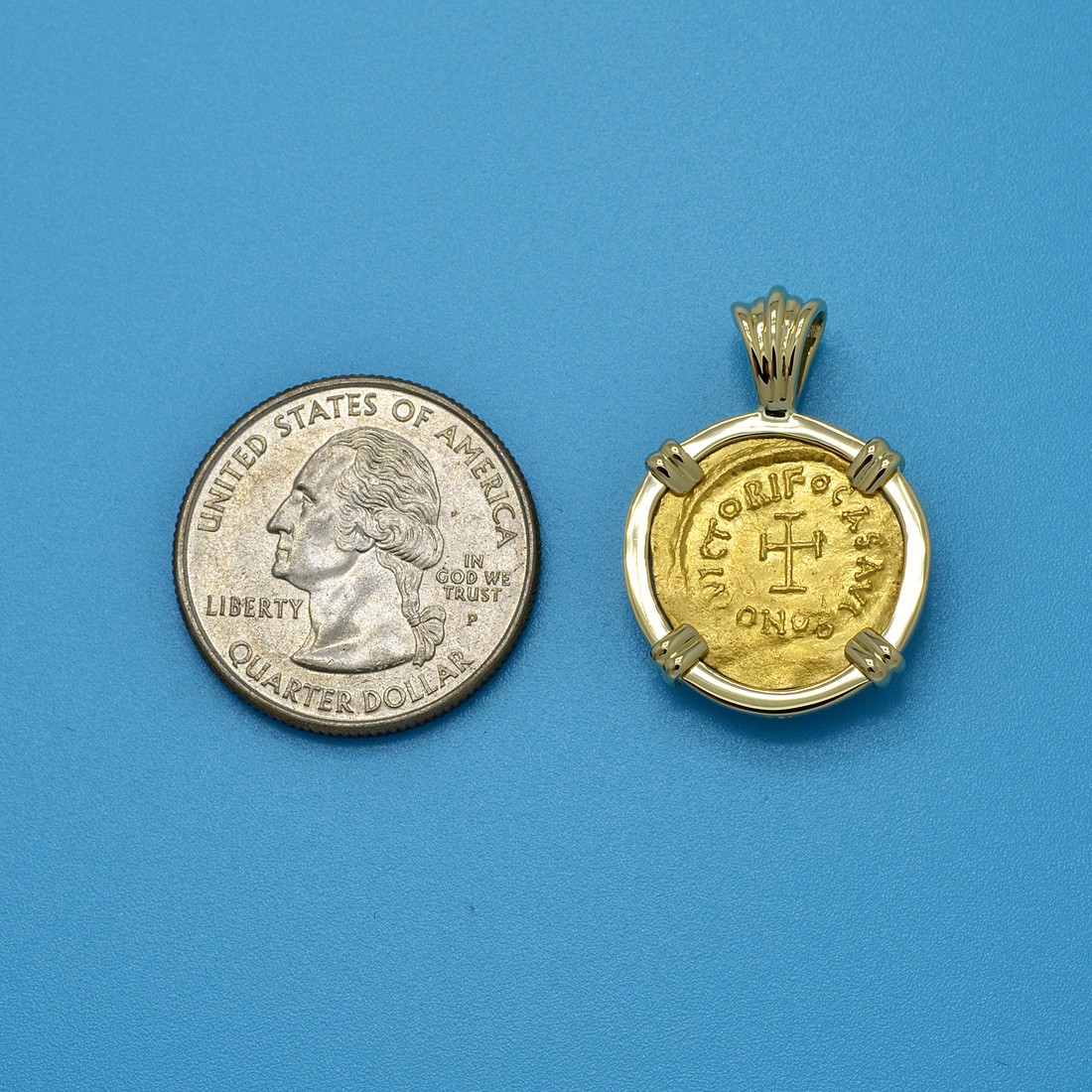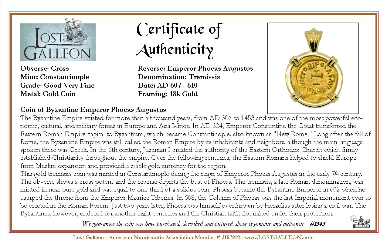 This gold tremissis coin was minted in Constantinople during the reign of Emperor Phocas Augustus in the early 7th century. The obverse shows a cross potent and the reverse depicts the bust of Phocas. The tremissis, a late Roman denomination, was minted in near pure gold and was equal to one-third of a solidus coin. Phocas became the Byzantine Emperor in 602 when he usurped the throne from the Emperor Maurice Tiberius. In 608, the Column of Phocas was the last Imperial monument ever to be erected in the Roman Forum. Just two years later, Phocas was himself overthrown by Heraclius after losing a civil war. The Byzantines, however, endured for another eight centuries and the Christian faith flourished under their protection.