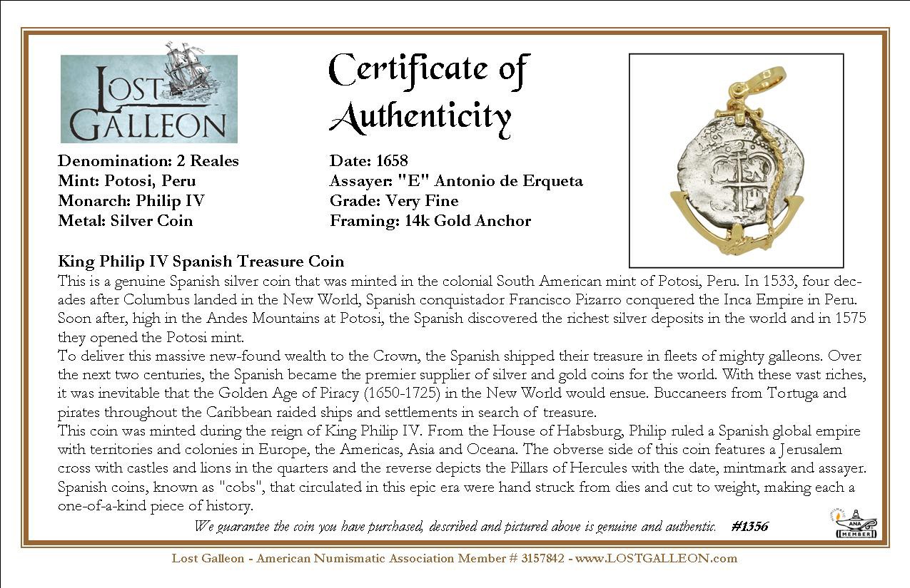 This coin was minted during the reign of King Philip IV. From the House of Habsburg, Philip ruled a Spanish global empire with territories and colonies in Europe, the Americas, Asia and Oceana. The obverse side of this coin features a Jerusalem cross with castles and lions in the quarters and the reverse depicts the Pillars of Hercules with the date, mintmark and assayer. Spanish coins, known as "cobs", that circulated in this epic era were hand struck from dies and cut to weight, making each a one-of-a-kind piece of history.