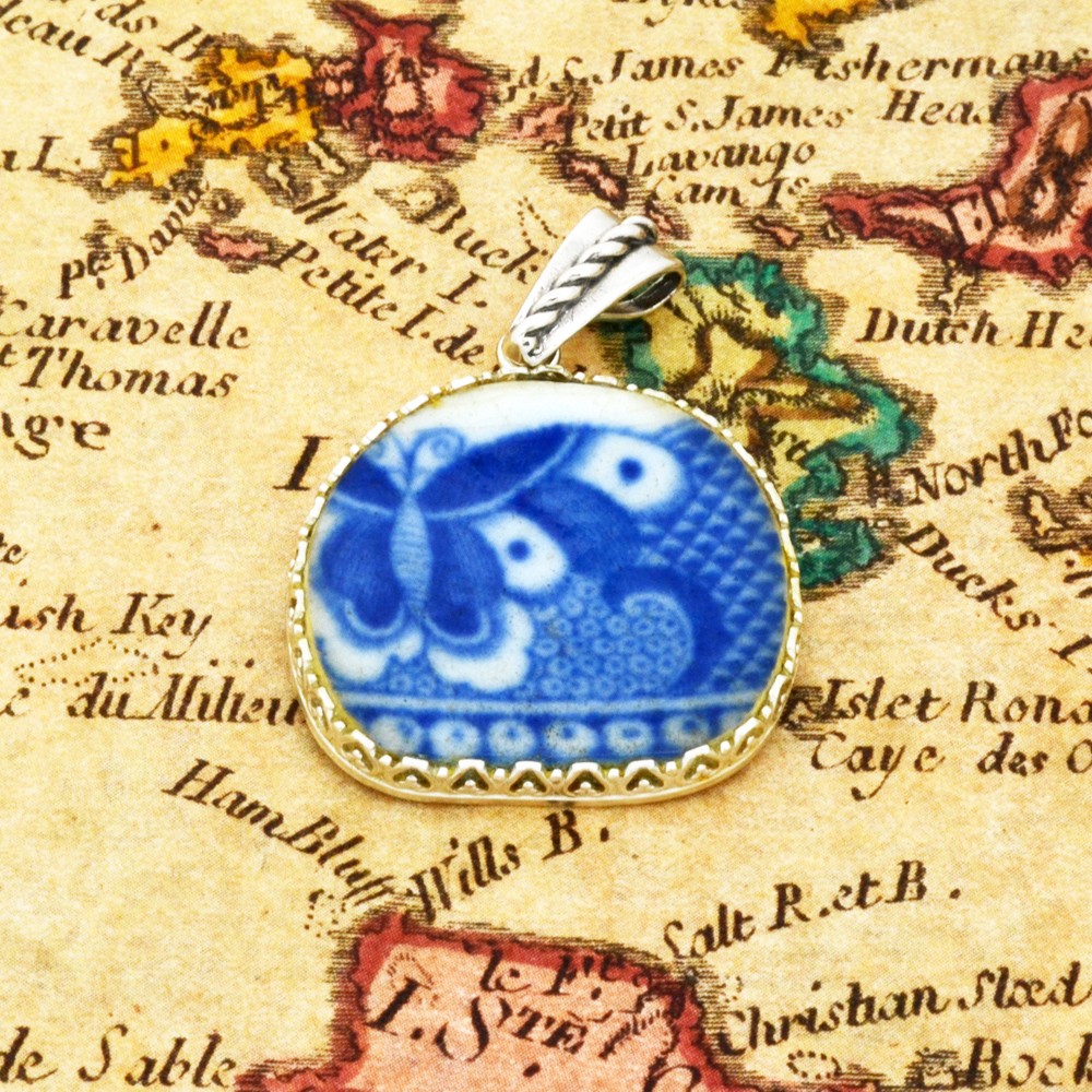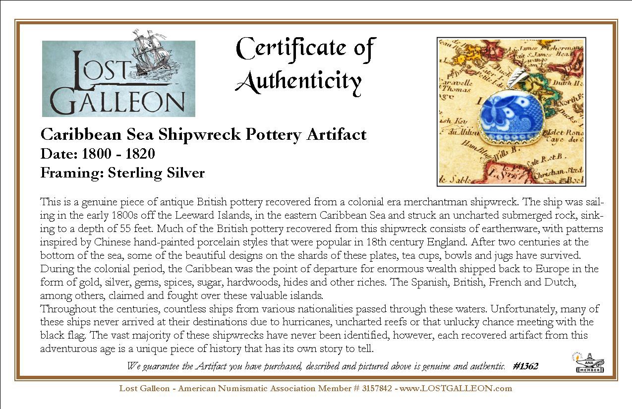 This is a genuine piece of antique British pottery recovered from a colonial era merchantman shipwreck. The ship was sailing in the early 1800s off the Leeward Islands, in the eastern Caribbean Sea and struck an uncharted submerged rock, sinking to a depth of 55 feet. Much of the British pottery recovered from this shipwreck consists of earthenware, with patterns inspired by Chinese hand-painted porcelain styles that were popular in 18th century England. After two centuries at the bottom of the sea, some of the beautiful designs on the shards of these plates, tea cups, bowls and jugs have survived.
