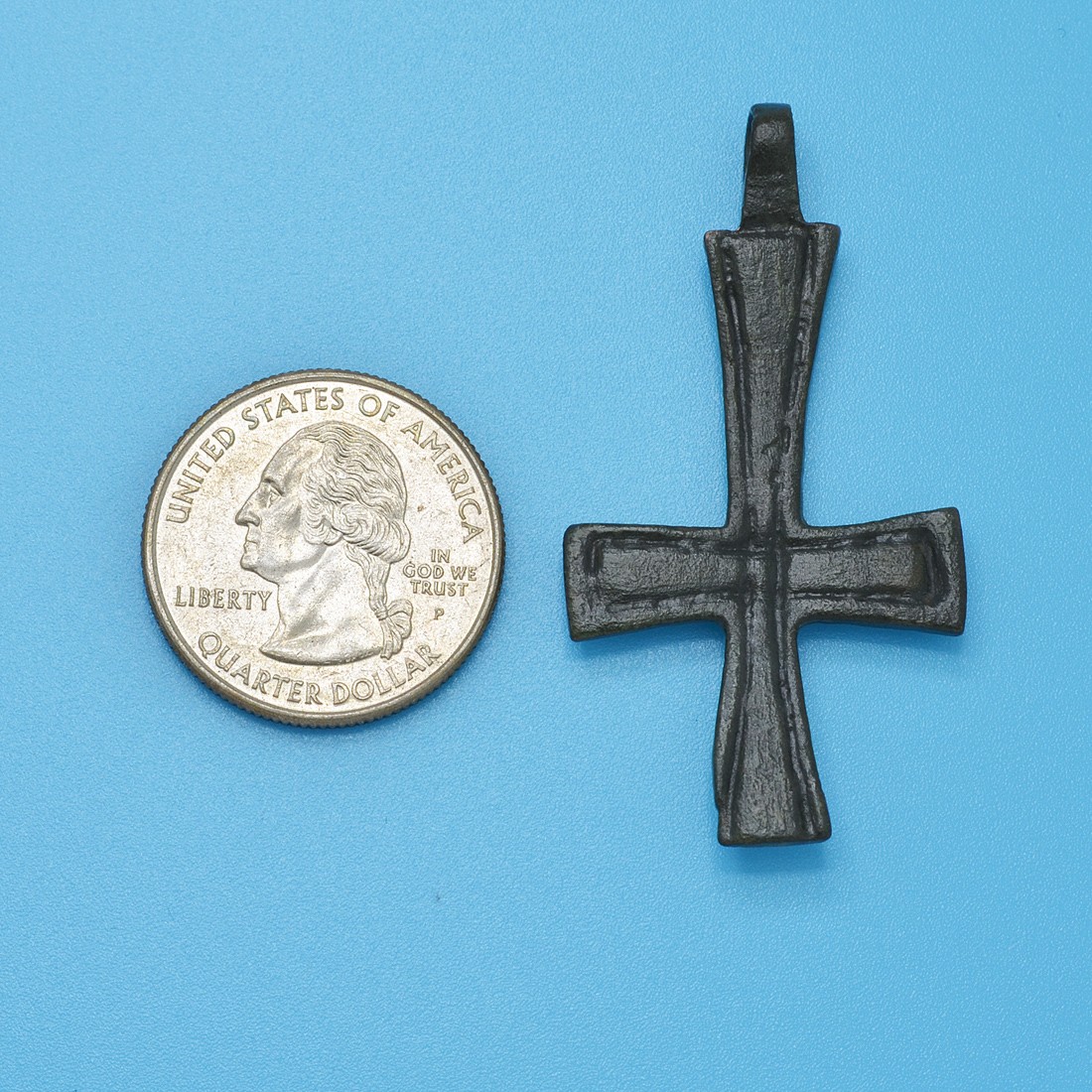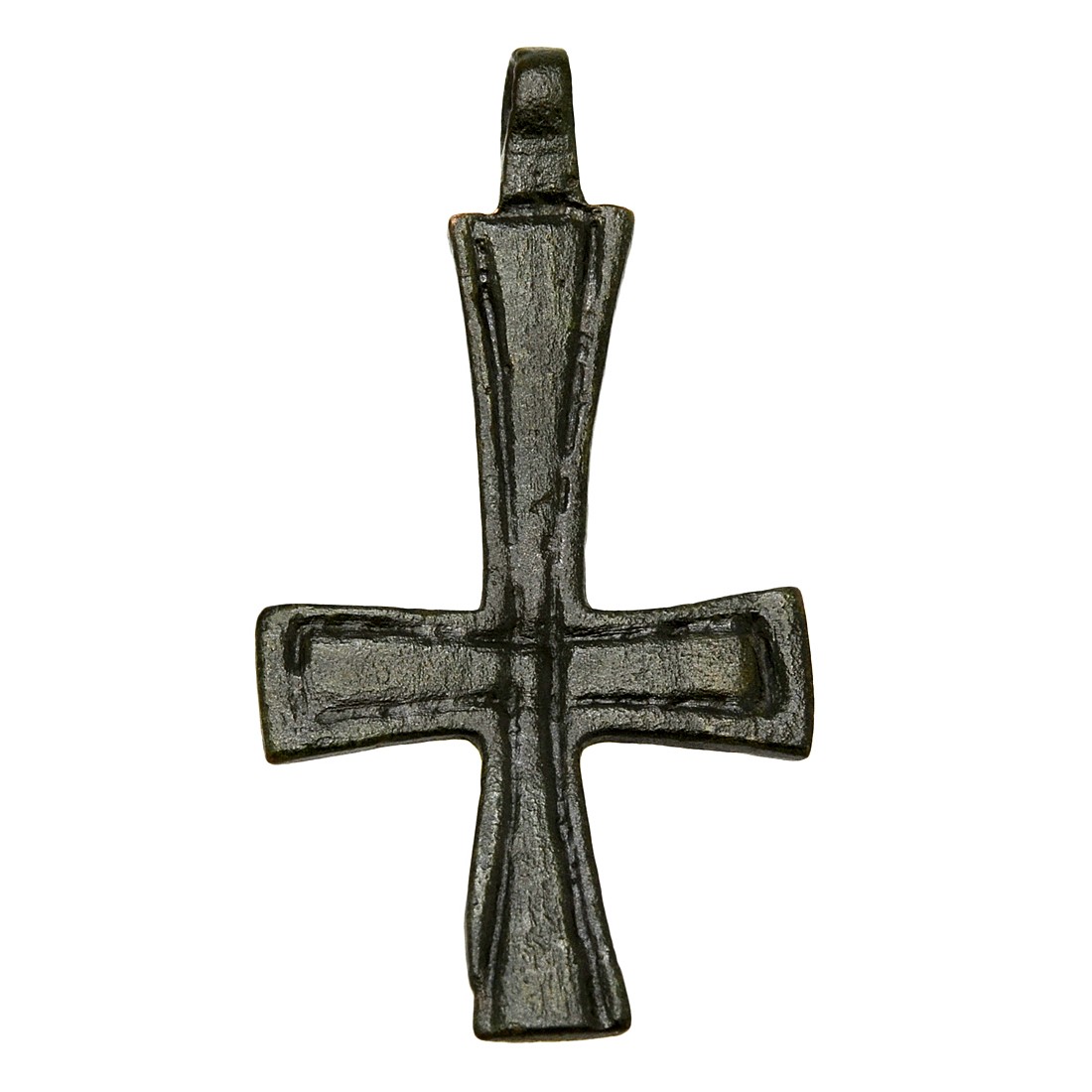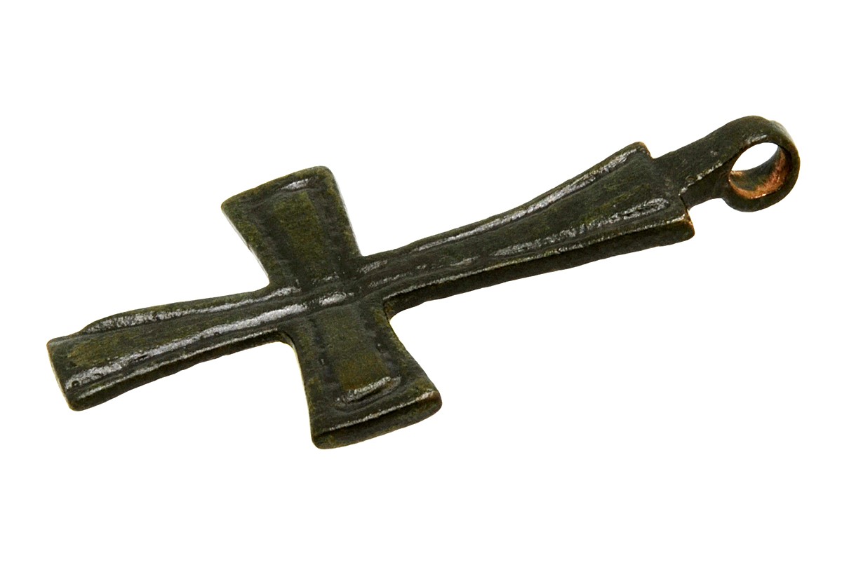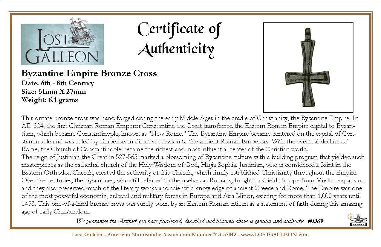 Over the centuries, the Byzantines, who still referred to themselves as Romans, fought to shield Europe from Muslim expansion and they also preserved much of the literary works and scientific knowledge of ancient Greece and Rome. The Empire was one of the most powerful economic, cultural and military forces in Europe and Asia Minor, existing for more than 1,000 years until 1453. This one-of-a-kind bronze cross was surely worn by an Eastern Roman citizen as a statement of faith during this amazing age of early Christendom.