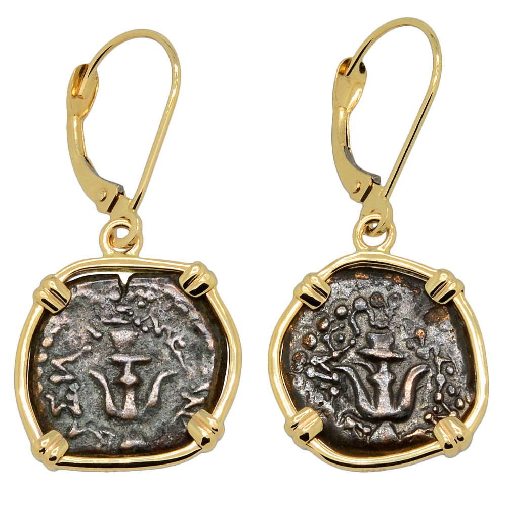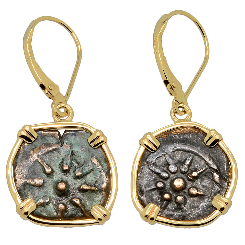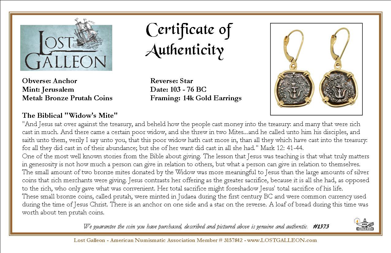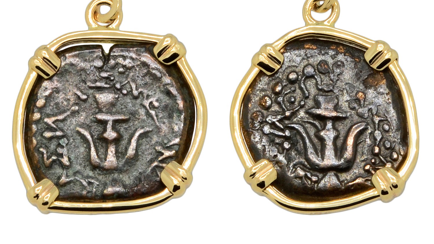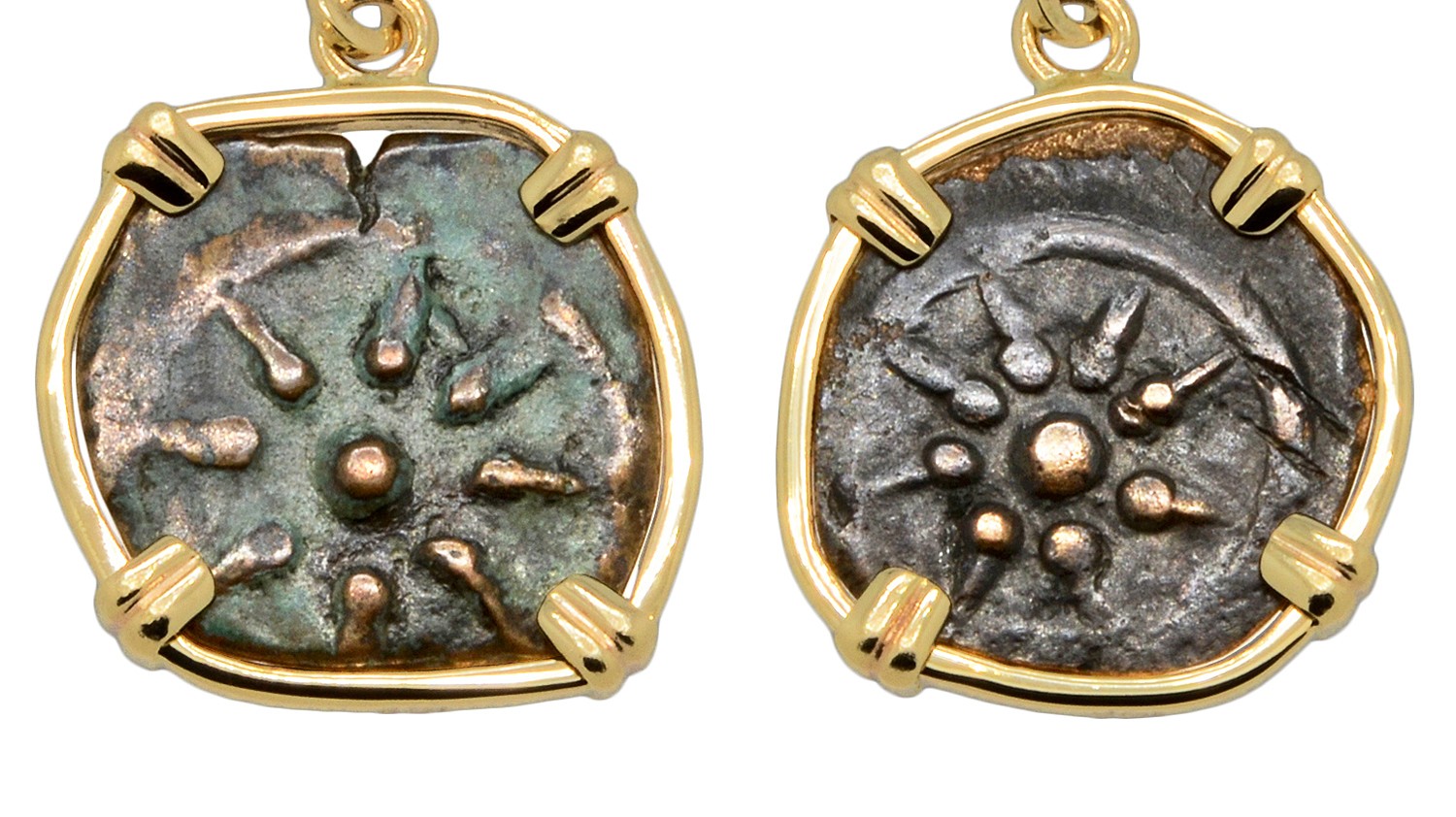 These small bronze coins, called prutah, were minted in Judaea during the first century BC and were common currency used during the time of Jesus Christ. There is an anchor on one side and a star on the reverse. A loaf of bread during this time was worth about ten prutah coins.