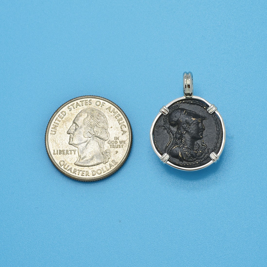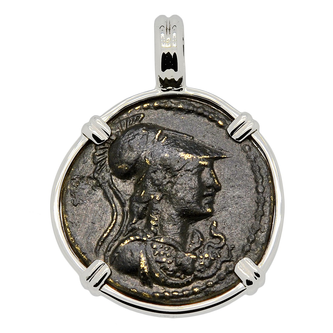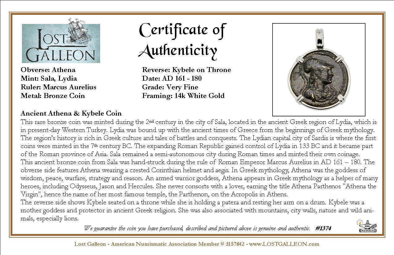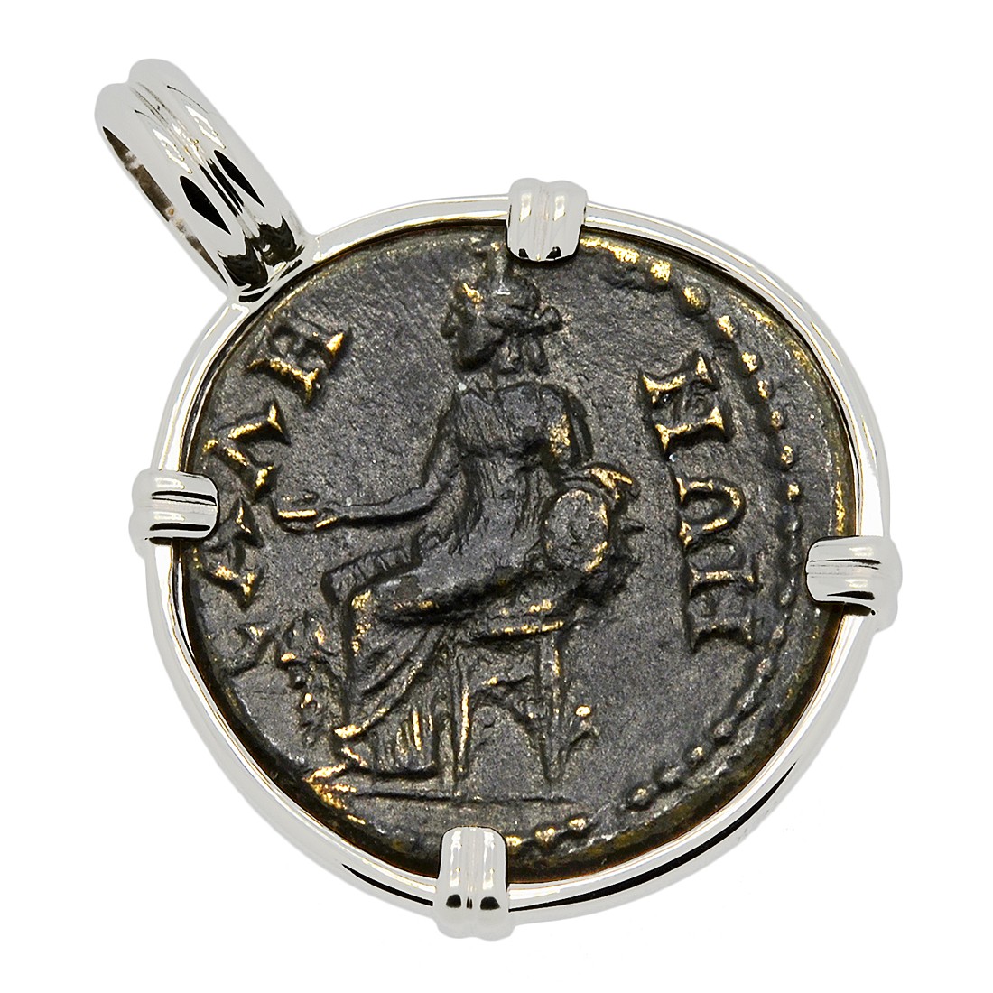 This ancient bronze coin from Sala was hand-struck during the rule of Roman Emperor Marcus Aurelius in AD 161 – 180. The obverse side features Athena wearing a crested Corinthian helmet and aegis. In Greek mythology, Athena was the goddess of wisdom, peace, warfare, strategy and reason. An armed warrior goddess, Athena appears in Greek mythology as a helper of many heroes, including Odysseus, Jason and Hercules. She never consorts with a lover, earning the title Athena Parthenos "Athena the Virgin", hence the name of her most famous temple, the Parthenon, on the Acropolis in Athens.