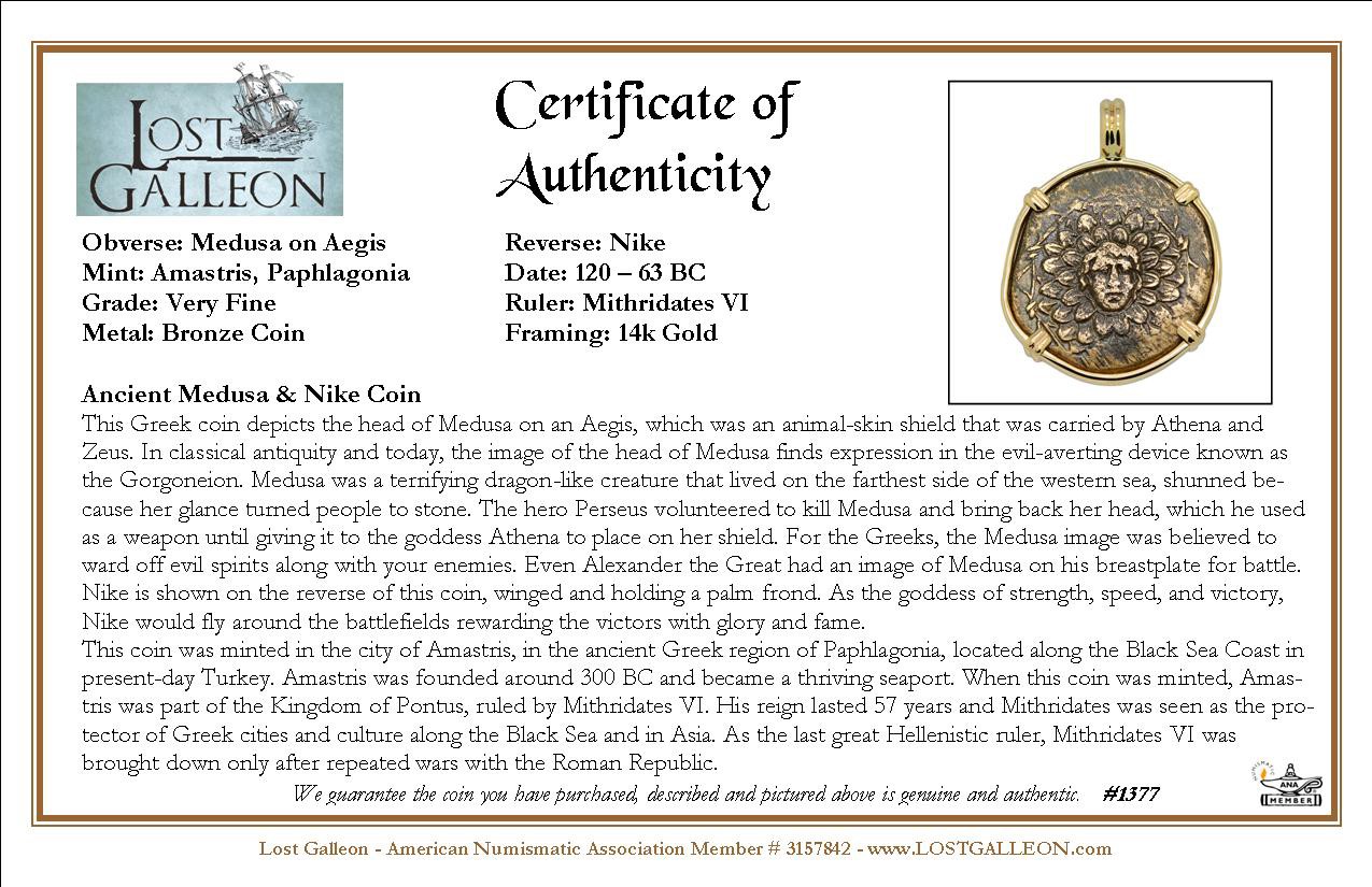 This Greek coin depicts the head of Medusa on an Aegis, which was an animal-skin shield that was carried by Athena and Zeus. In classical antiquity and today, the image of the head of Medusa finds expression in the evil-averting device known as the Gorgoneion. Medusa was a terrifying dragon-like creature that lived on the farthest side of the western sea, shunned because her glance turned people to stone. The hero Perseus volunteered to kill Medusa and bring back her head, which he used as a weapon until giving it to the goddess Athena to place on her shield. For the Greeks, the Medusa image was believed to ward off evil spirits along with your enemies. Even Alexander the Great had an image of Medusa on his breastplate for battle.