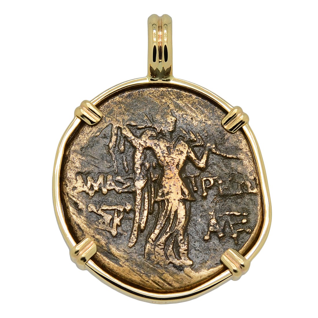 Nike is shown on the reverse of this coin, winged and holding a palm frond. As the goddess of strength, speed, and victory, Nike would fly around the battlefields rewarding the victors with glory and fame.