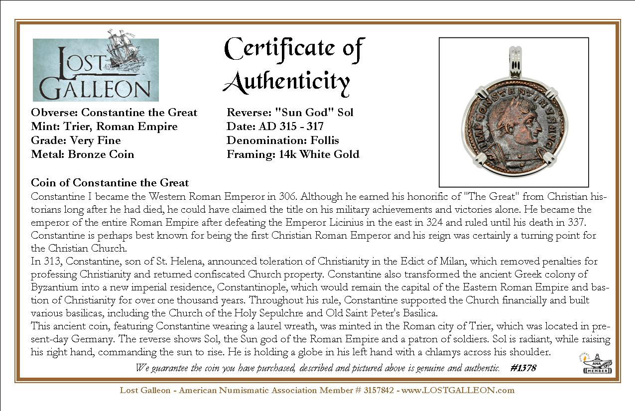 This ancient coin, featuring Constantine wearing a laurel wreath, was minted in the Roman city of Trier, which was located in present-day Germany. The reverse shows Sol, the Sun god of the Roman Empire and a patron of soldiers. Sol is radiant, while raising his right hand, commanding the sun to rise. He is holding a globe in his left hand with a chlamys across his shoulder.